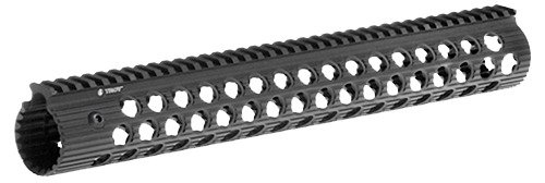 Compatible with AR-15 rifles, the Troy Alpha Rail 15" Railed Fore-End is constructed of aircraft-grade aluminum with an anodized finish. The fore-end allows a variety of mounting options with 8 angles of attachment and includes 1 fixed and 3 detachable rails. Low-profile locking mechanism