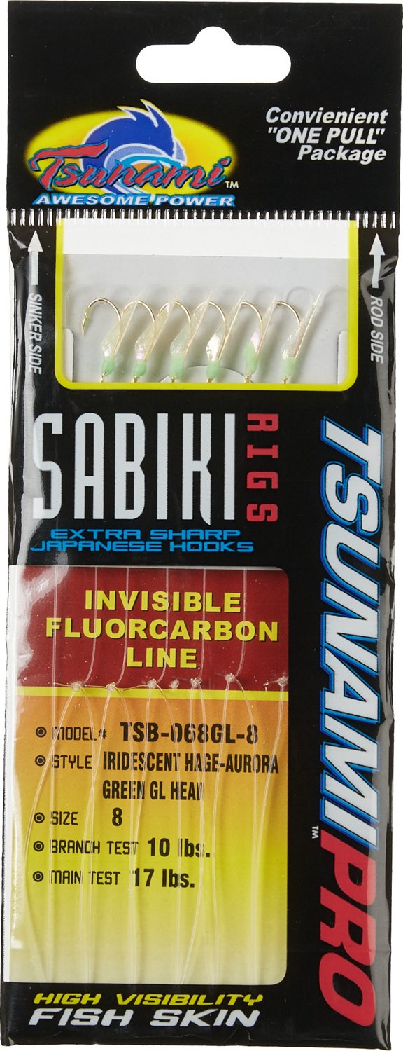 Reel in your next saltwater catch with help from the Tsunami Pro Iridescent Sabiki Rig. Outfitted with iridescent heads, as well as fish skin dressing, this rig is sure to draw in bites, and the fluorocarbon leader virtually disappears in the water to help prevent fish from being scared off.