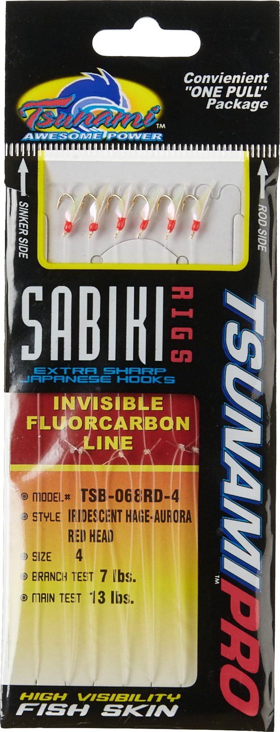 Reel in your next saltwater catch with help from the Tsunami Pro Iridescent Sabiki Rig. Outfitted with iridescent heads, as well as fish skin dressing, this rig is sure to draw in bites, and the fluorocarbon leader virtually disappears in the water to help prevent fish from being scared off.