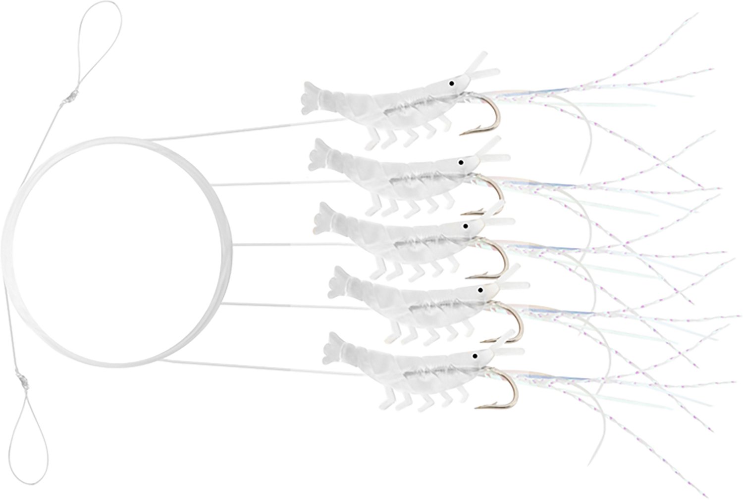 Catch a variety of saltwater species with the Tsunami Shrimp Rig 5-Pack. Each is crafted from a low-stretch monofilament for durability, and the lifelike appearance helps to draw fish in.