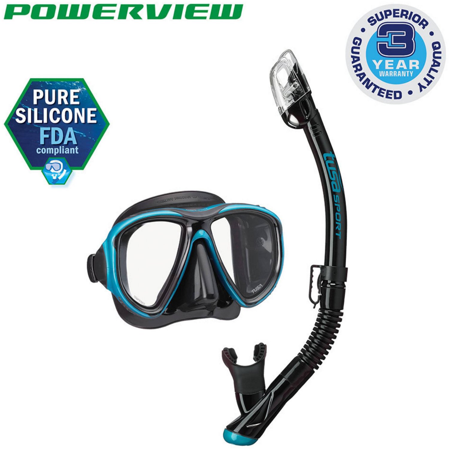 Get ready for a day of underwater exploration with the TUSA Adults' Powerview Dry Combo. This combo includes a mask and snorkel constructed from silicone for durability, while the 2-window design with ClearVu tempered glass lenses provides a wide field of view for increased visibility. Hyperdry Elite Dry Top technology helps keep water out of the snorkel, and the high-flow purge valve and drain chamber allow for quick clearing.