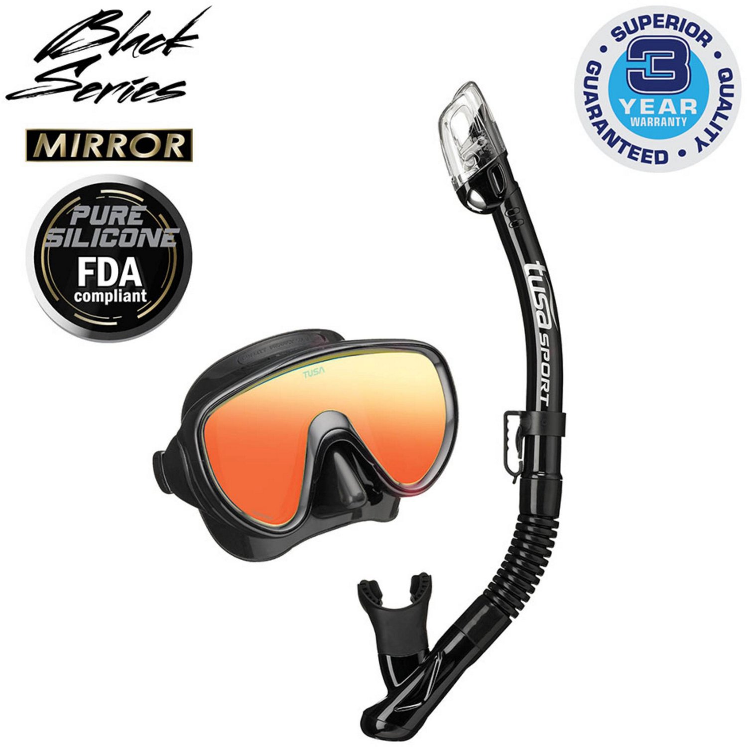Gear up for a day out on the water with the TUSA Adults' Serene Mirror Combo. This combo includes 1 UM-16 mask and 1 USP-250 dry snorkel. The dry snorkel is constructed with a pure silicone, flexible neck and mouthpiece for durability and comfort, while the 1-window design with ClearVu tempered glass lenses provides a wide field of view for increased visibility. Hyperdry Elite dry top technology helps keep water out of the snorkel, and the high-flow purge valve and drain chamber allow for quick clearing.