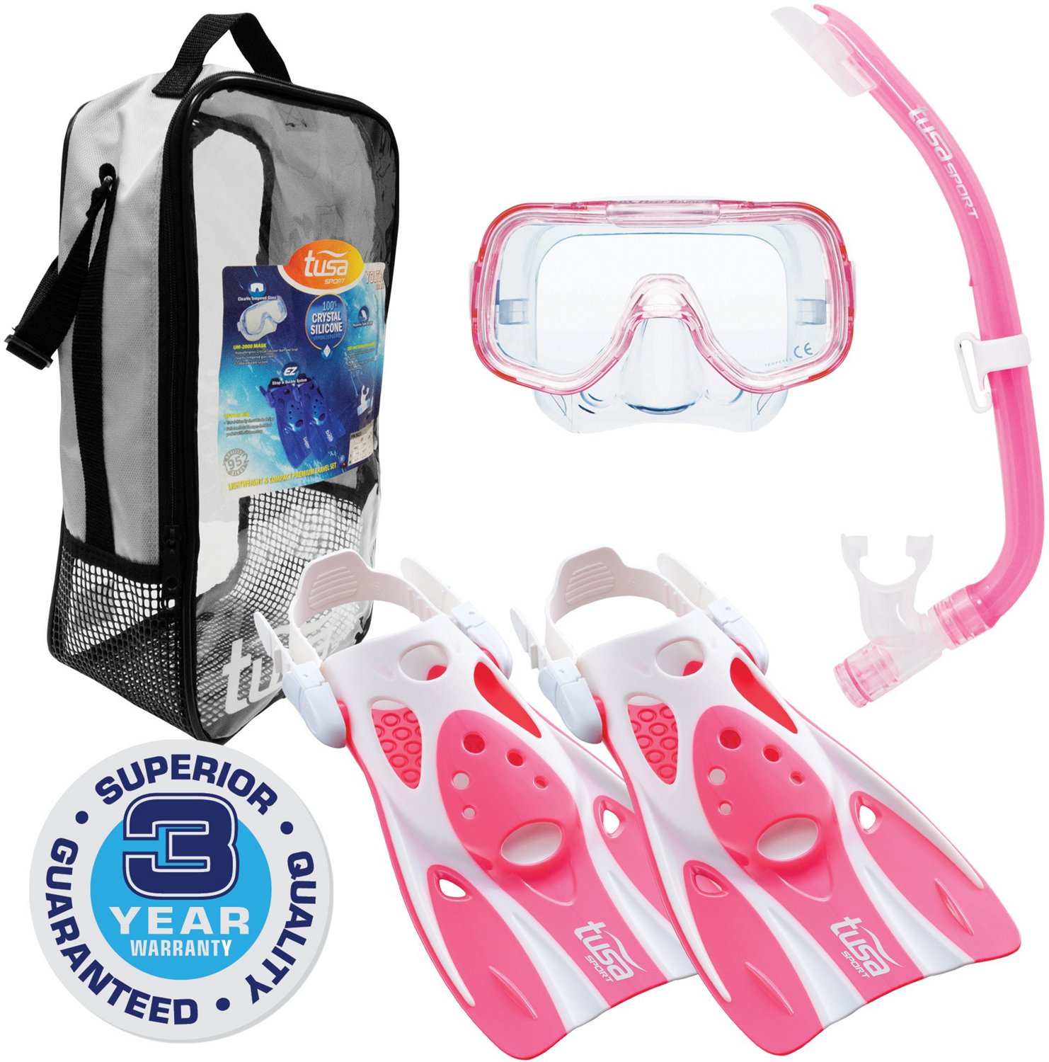 Get ready for a day in the water with the TUSA Kids' Mini-Kleio Hyperdry Travel Set. This combo includes a UM-2000 mask, a USP-140 snorkel and a pair of UF0103 fins constructed from pure silicone and polycarbonate materials for durability. The single-window design with ClearVu tempered glass lens provides a wide field of view for increased visibility. Hyperdry Semi-Dry Top technology helps keep water out of the snorkel, and the Hybrid Blade System offers increased movement, power and efficiency.