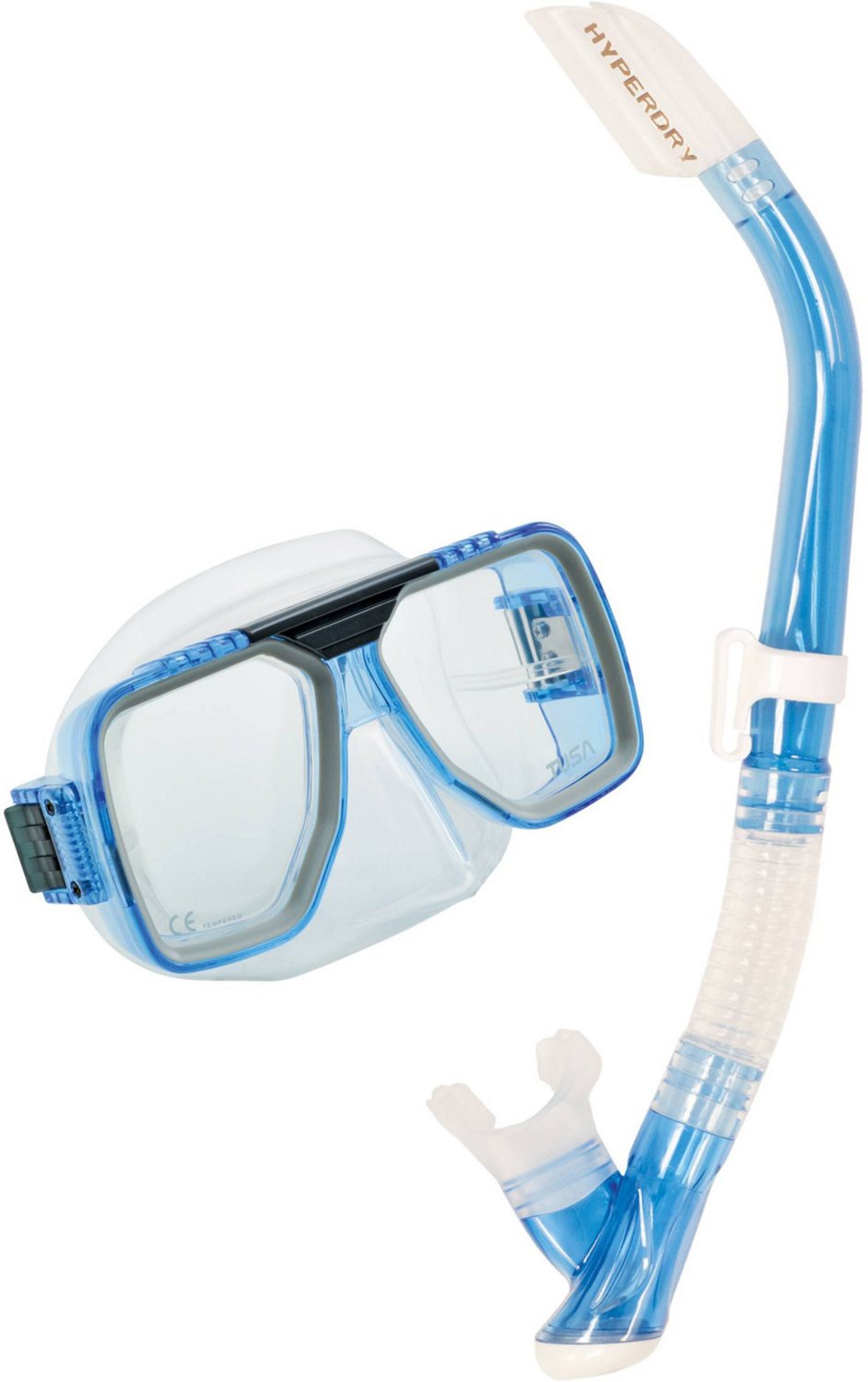 Start your underwater adventure with the TUSA Liberator Adults' Dry Combo. This combo includes 1 UM-5000 mask and 1 USP-190 snorkel constructed from pure silicone and polycarbonate material for durability, while the 2-window design with ClearVu tempered glass lenses provides a wide field of view for increased visibility. Hyperdry technology helps keep water out of the snorkel, and the high-flow purge valve and drain chamber allows for quick clearing.