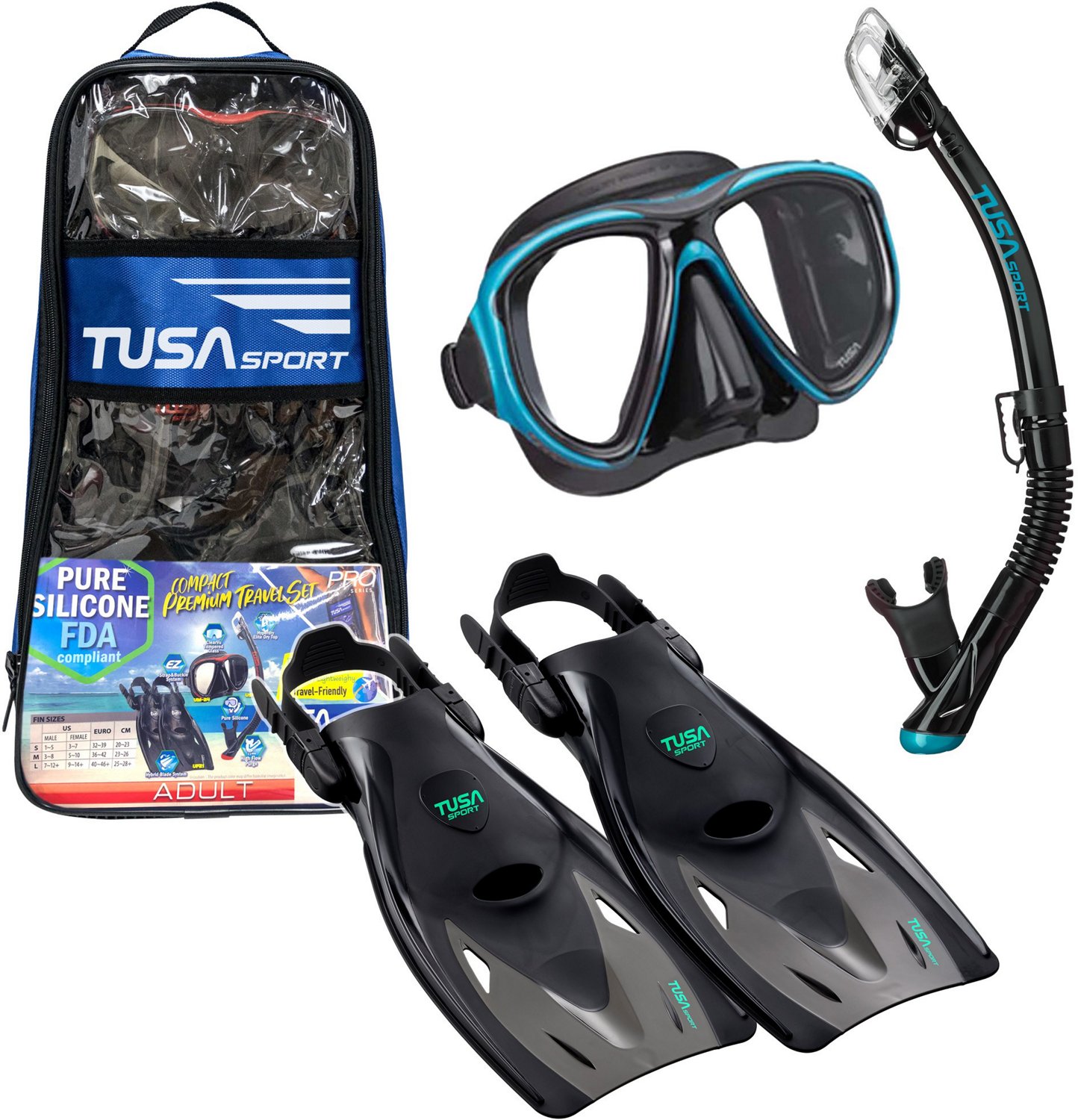 Take a look at the underwater environment with the TUSA Powerview Dry Travel Set. This set includes 1 UM-24 mask, 1 USP-250 snorkel and 1 pair of UF-21 fins constructed from pure silicone and polycarbonate material for durability, while the 2-window design with ClearVu tempered-glass lenses provides a wide field of view. Hyperdry Elite Dry Top technology helps keep water out of the snorkel, and the high-flow purge valve and drain chamber allow for quick clearing.
