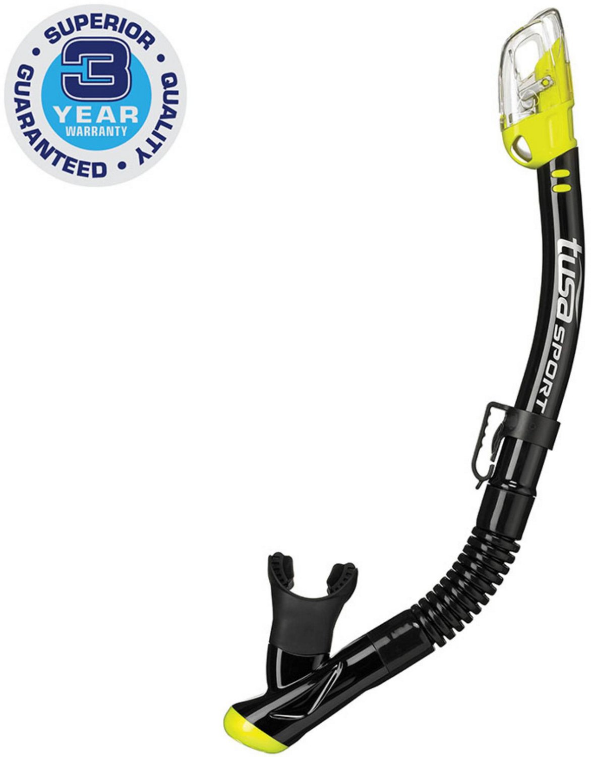 Stay underwater longer with the TUSA Sport USP250QB Dry Top Snorkel. This snorkel uses Hyperdry Elite Dry Top technology to keep water out of the airway and has a high-flow purge valve and drain chamber for quick clearing. The ortho-consciously designed, pure silicone mouthpiece provides comfortable wear.