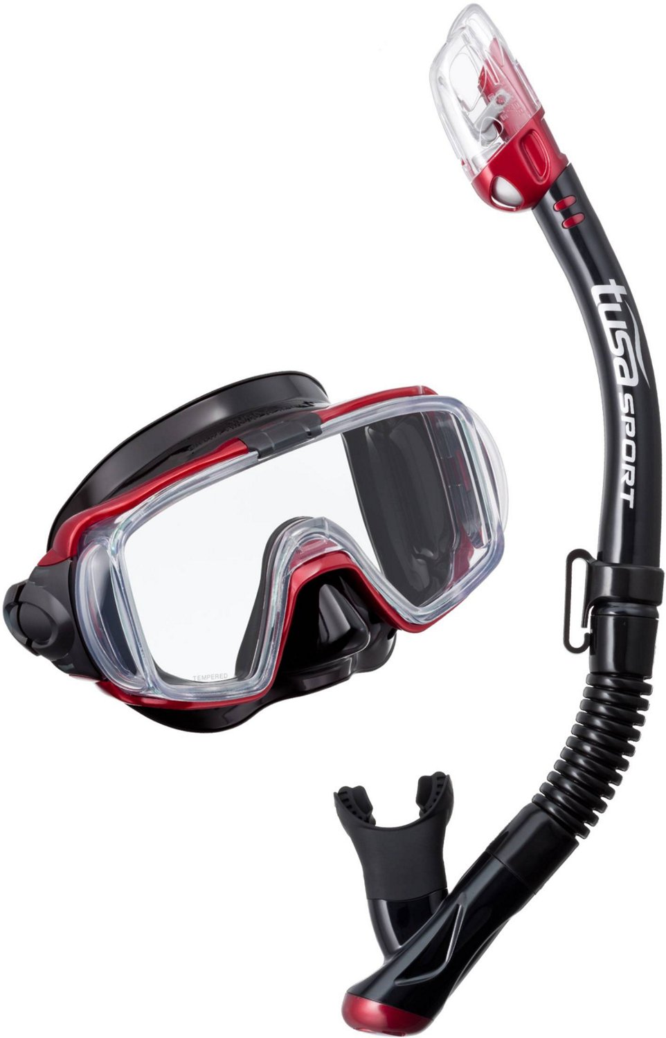 Go for a swim with the TUSA Visio Tri-Ex Combo. This combo includes a UM-31 mask and a USP-250 snorkel constructed from pure silicone and polycarbonate materials for durability. The panoramic design with domed side windows and ClearVu tempered-glass lenses provides a wide field of view for increased visibility. Hyperdry Elite Dry Top technology helps keep water out of the snorkel, and the high-flow purge valve and drain chamber allow quick clearing.