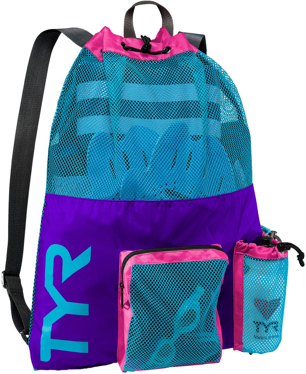 Tote your gear to and from the pool in the TYR String Backpack. Its spacious main compartment is made of mesh to let wet items drain and dry. Side pockets and a water bottle compartment offer additional organization, while shoulder straps keep carrying comfortable. Bold colors add a fun look.