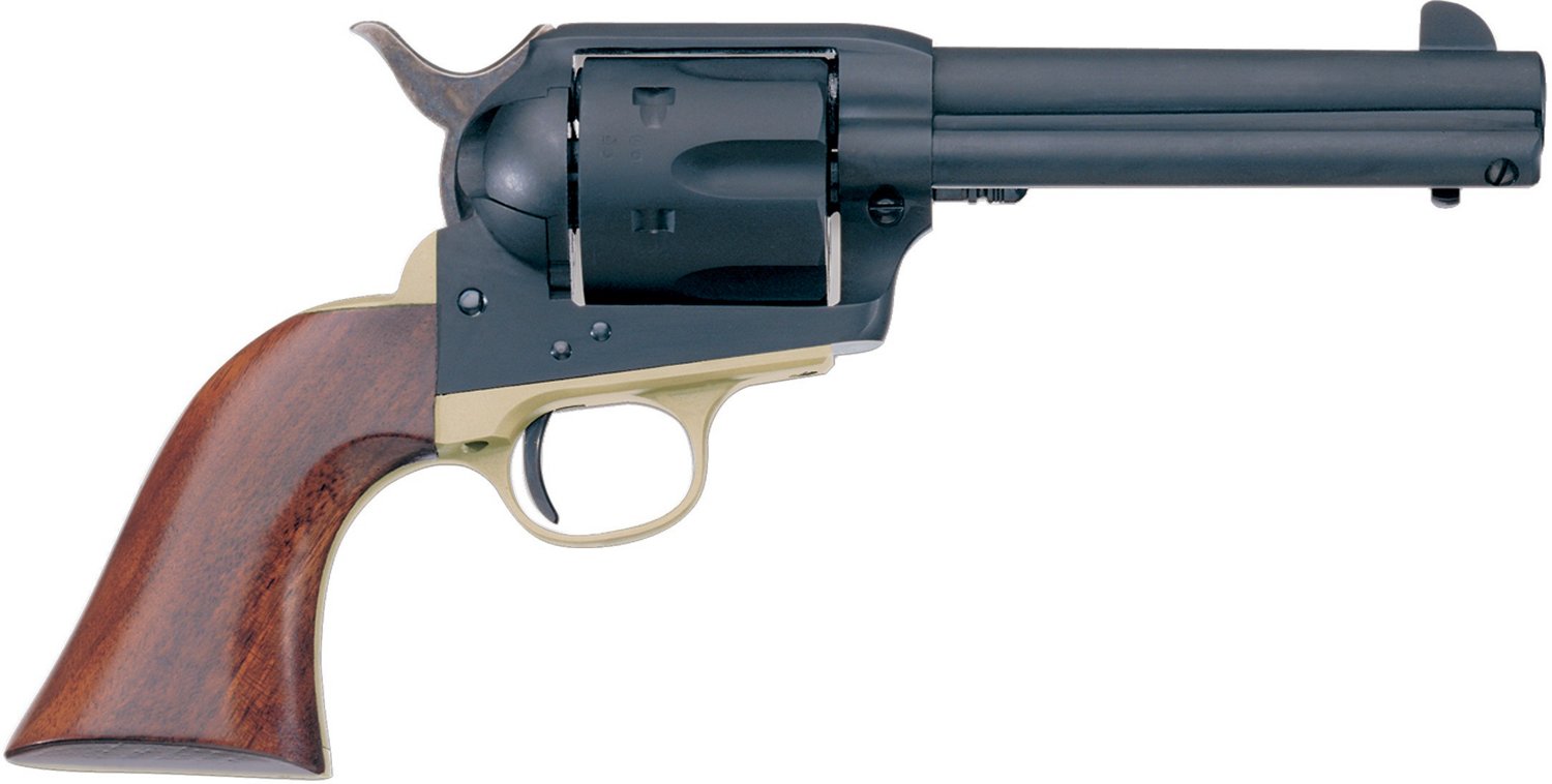 The Uberti 1873 Cattleman Hombre .45 Colt Revolver Centerfire Pistol is designed with a matte blued barrel and frame and a walnut grip. This firearm features a fixed front sight, a brass backstrap and a trigger guard. The magazine capacity holds up to 6 rounds.