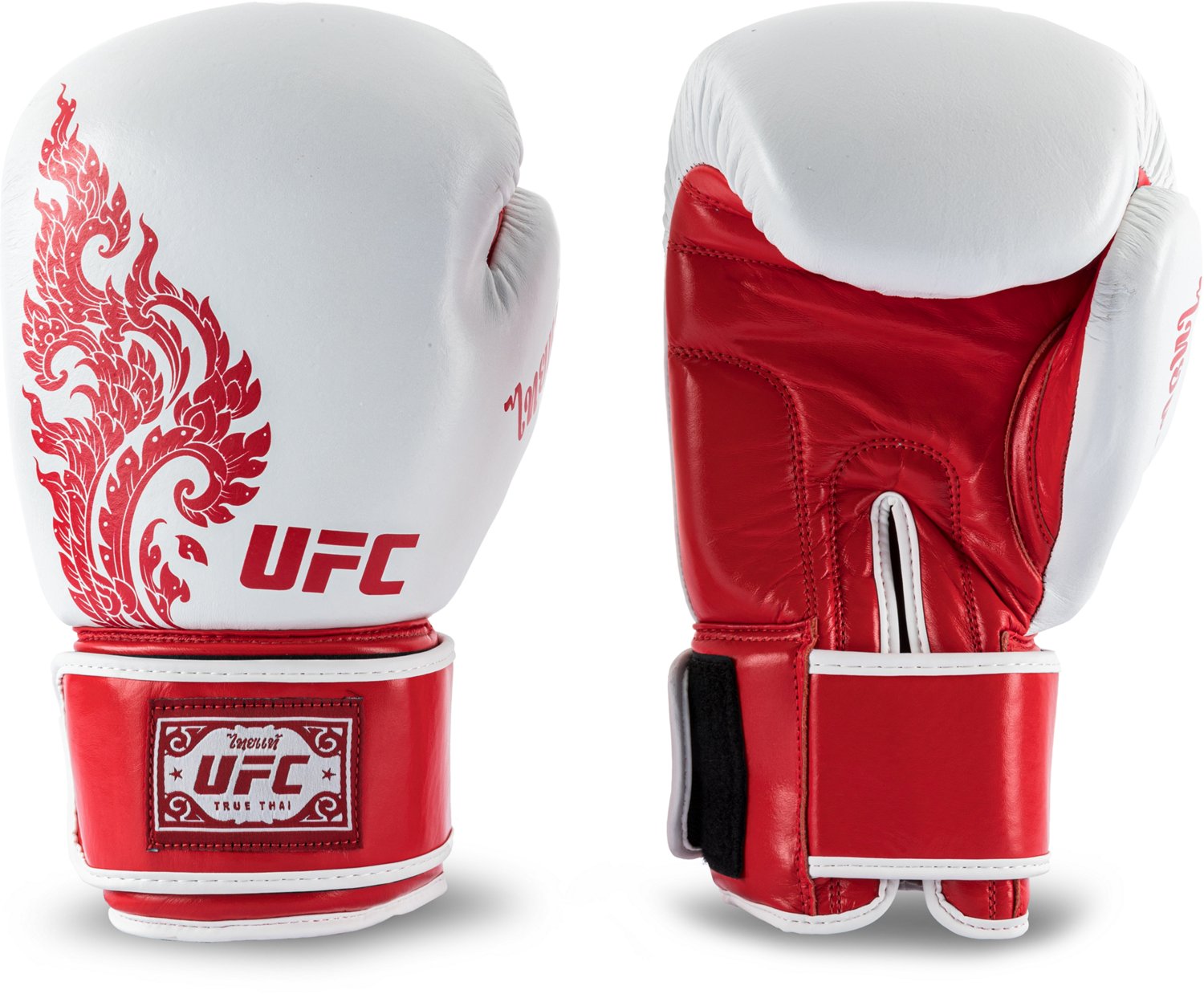 Protect your hands while training with the UFC True Thai Train Gloves. These leather gloves are durable and have a moisture-wicking liner and perforated palms that help your hands stay cool and dry. Thick foam rubber padding cushions your knuckles, hands and thumbs during intense training sessions. Hook-and-loop closures support wrists and provide a comfortable fit.