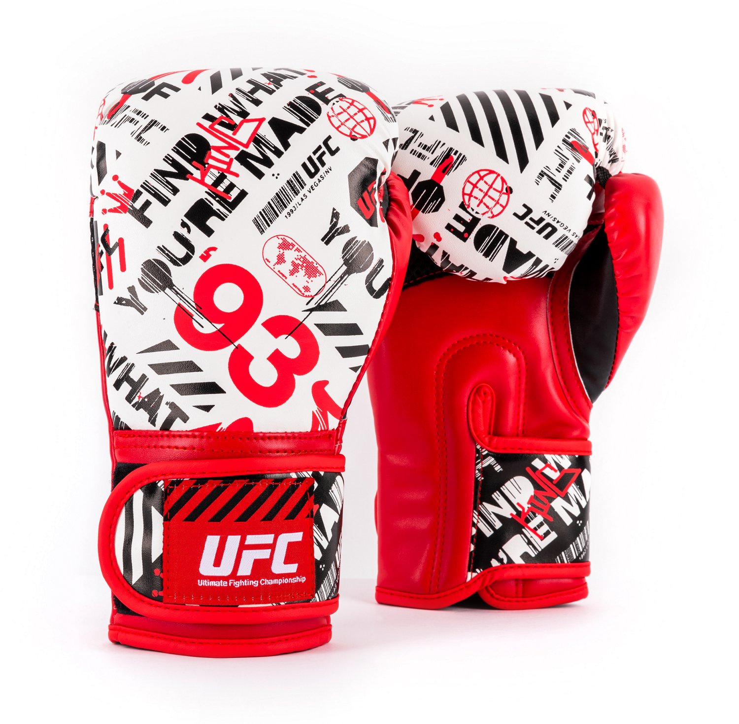 Protect your hands in style with the UFC Youth Made Boxing Gloves. These durable gloves have impact-dispersing padding to help protect your hands, thumbs and fingers during long training sessions. Small hand compartments provide a comfortable fit for small hands, while hook-and-loop straps provide an adjustable fit.