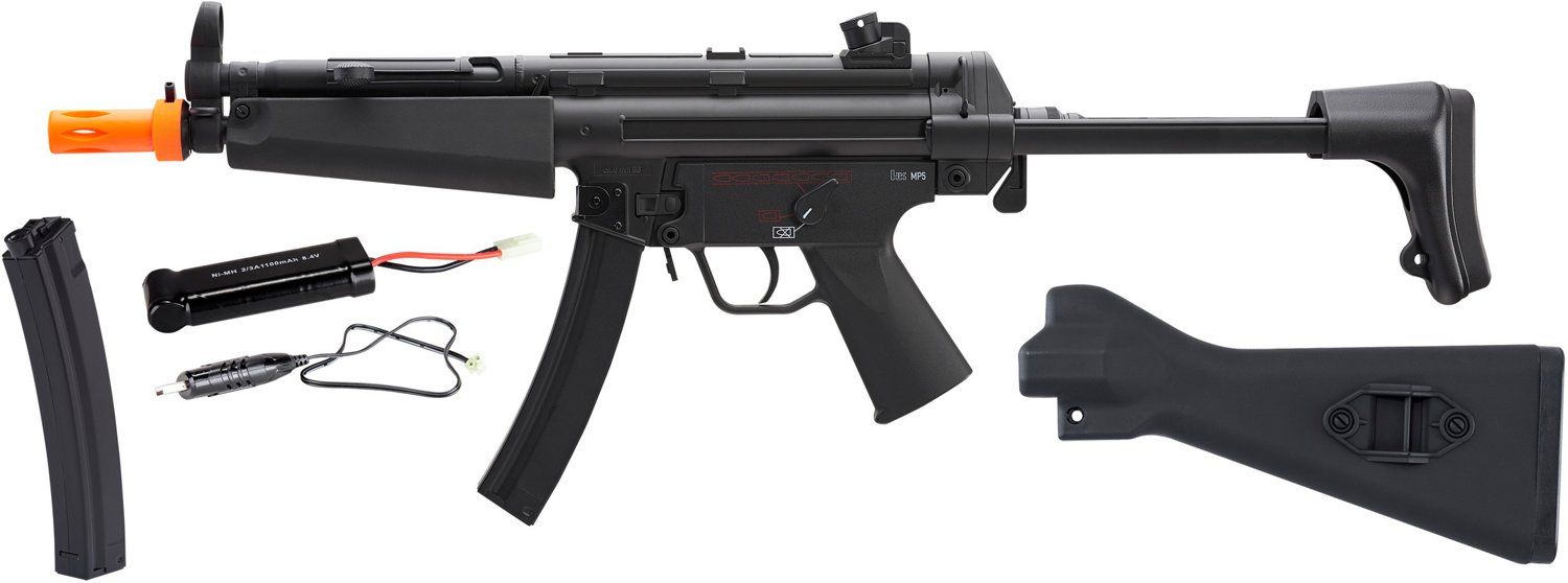 The Umarex USA HK MP5 Airsoft Competition 6mm Air Rifle Kit is great for recreational shooting. Featuring an adjustable hop-up, this air rifle comes with a fixed front sight and adjustable diopter rear sight. The air rifle uses an 8.4V NiMh battery and can be recharged using the included USB charger.