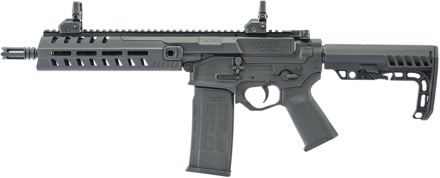 Enjoy backyard shooting with your friends with the Umarex USA Strikeforce .177 Caliber Auto BB Air Gun. This BB air gun uses .177 caliber BB carbines and has a full-length top Picatinny rail to attach scopes, optics and other accessories. The three-position thumb-operated switch allows for easy flipping between automatic and semiautomatic, and the 10-inch profile barrel creates a sleek and realistic look.
