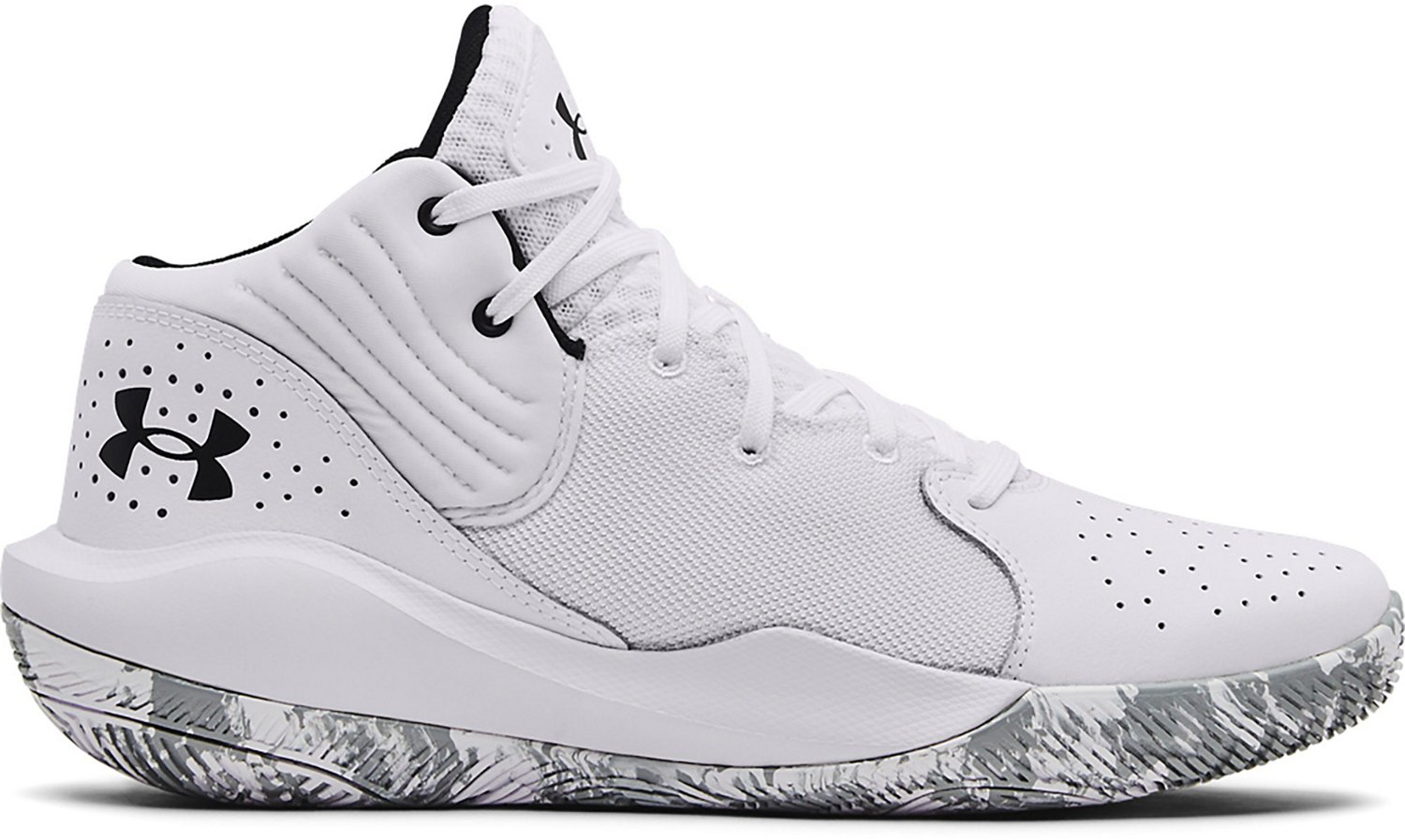 Showcase your skills on the court in the Under Armour Adults' Jet 2021 Basketball Shoes. The mesh and perforated leather uppers provide a lightweight, breathable feel, while the EVA midsoles deliver responsive cushioning and the rubber outsoles with herringbone patterns supply reliable court traction and grip on the go.