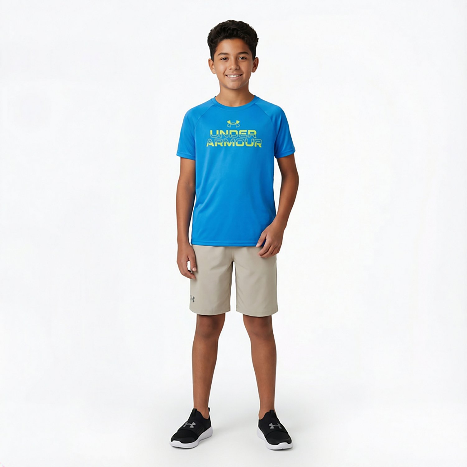 Train like a pro with the Under Armour Boys' Tech Split Wordmark T-shirt. The polyester material provides a comfortable feel, while the UA Tech fabric quickly dries for a soft touch. The moisture wicking technology helps keep you cool and dry, and the wordmark design delivers a stylish look.