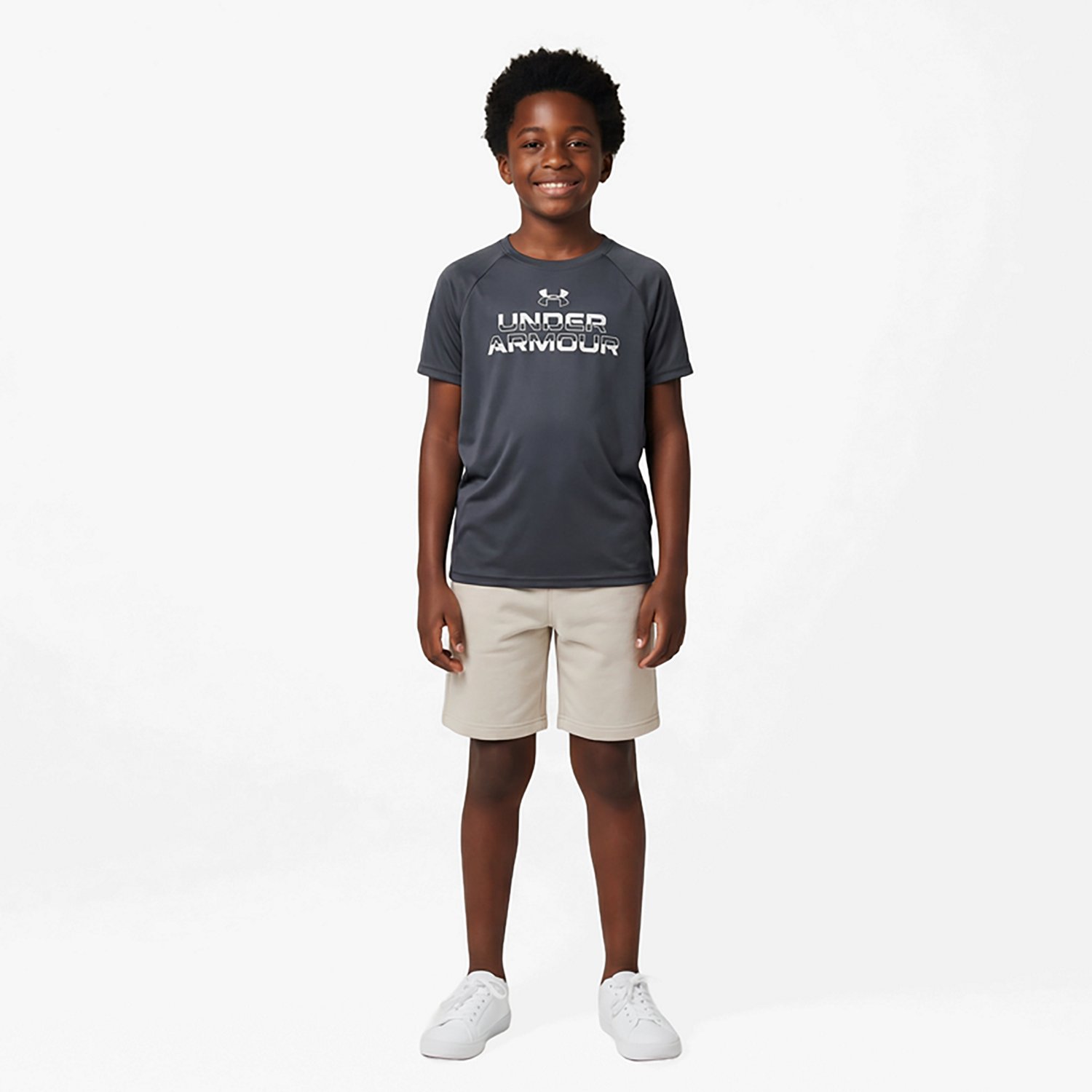 Train like a pro with the Under Armour Boys' Tech Split Wordmark T-shirt. The polyester material provides a comfortable feel, while the UA Tech fabric quickly dries for a soft touch. The moisture wicking technology helps keep you cool and dry, and the wordmark design delivers a stylish look.