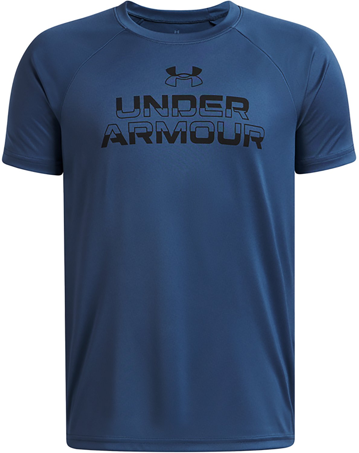 Train like a pro with the Under Armour Boys' Tech Split Wordmark T-shirt. The polyester material provides a comfortable feel, while the UA Tech fabric quickly dries for a soft touch. The moisture wicking technology helps keep you cool and dry, and the wordmark design delivers a stylish look.