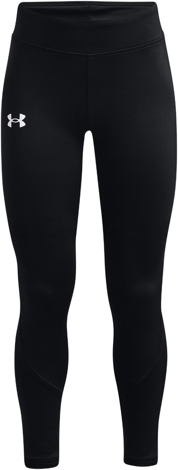 Beat the chill in the Under Armour Girls' ColdGear Leggings. The lightweight stretch fabric allows a full range of mobility with a flat waistband and ergonomic seams for easy layering. ColdGear technology combines a smooth exterior with a fluffy brushed interior to trap heat, wick sweat and dry quickly.