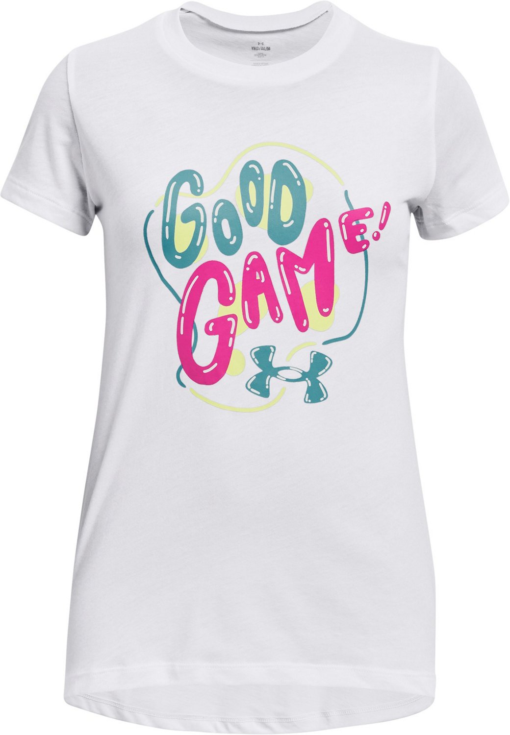 Feel confident during your workouts with the Under Armour Girls' Good Game T-shirt. The 60% cotton and 40% polyester construction offers a soft feel all day, and the graphic on the front adds a sleek look. The loose fit offers additional comfort with a fuller build.