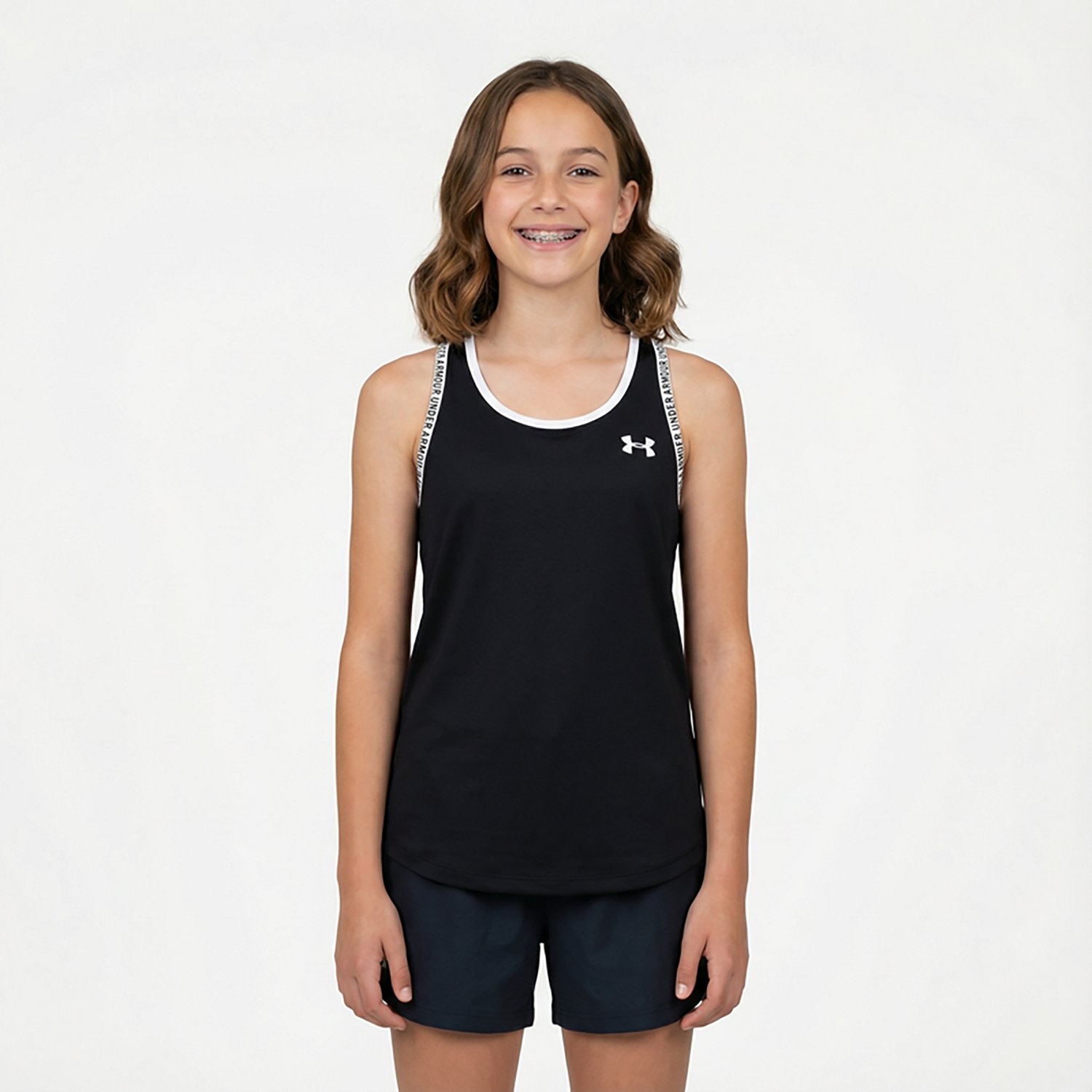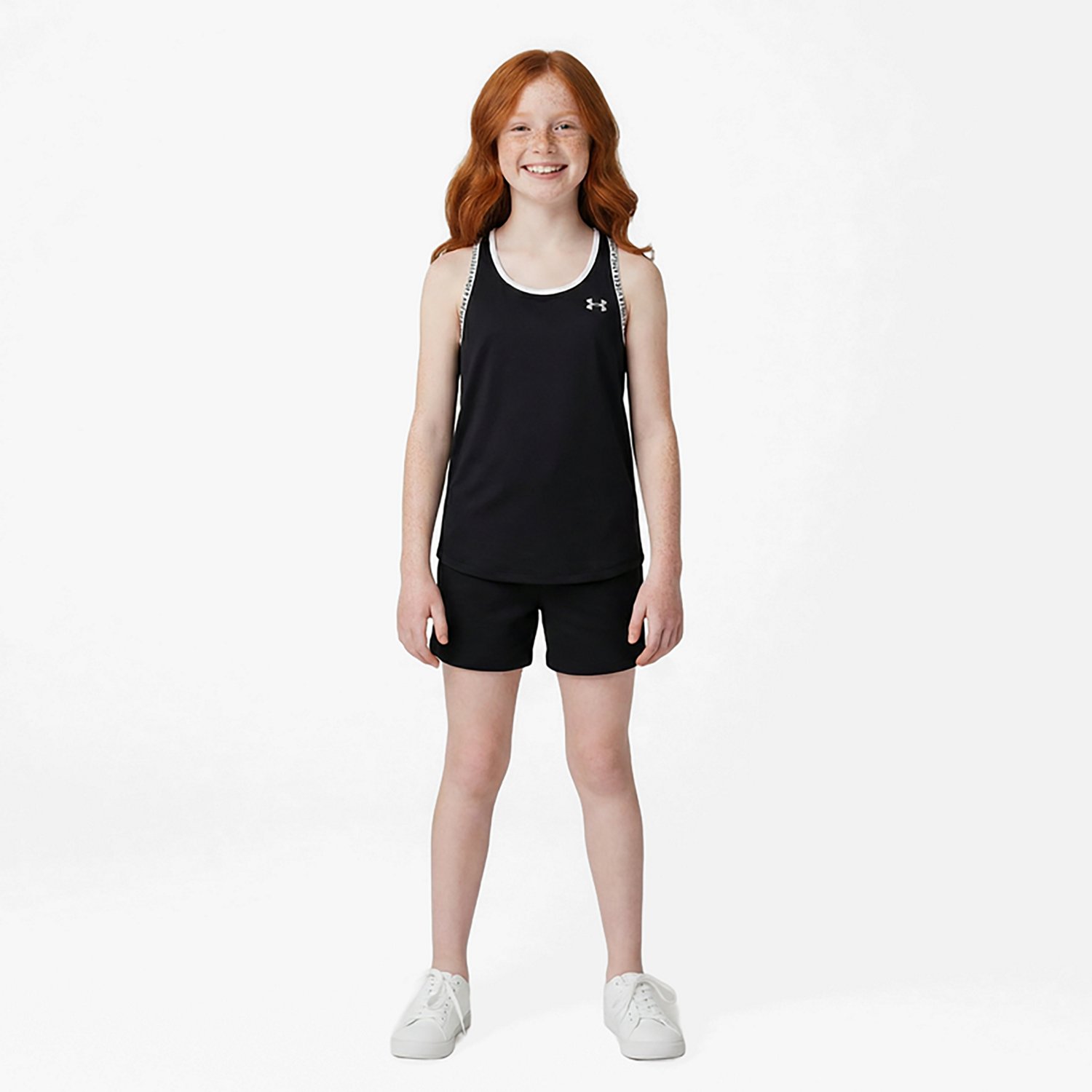 Crush sports and training in the Under Armour Girls' Knockout Tank. Made from 90% polyester and 10% elastane, the fabric couldn't get any softer or more breathable. Moisture-wicking and odor-resistant technologies keep you comfortable, while the T-back design delivers airflow, and the shaped hem keeps you covered while you move. Wordmark taping adds detail and contrast for sporty style.