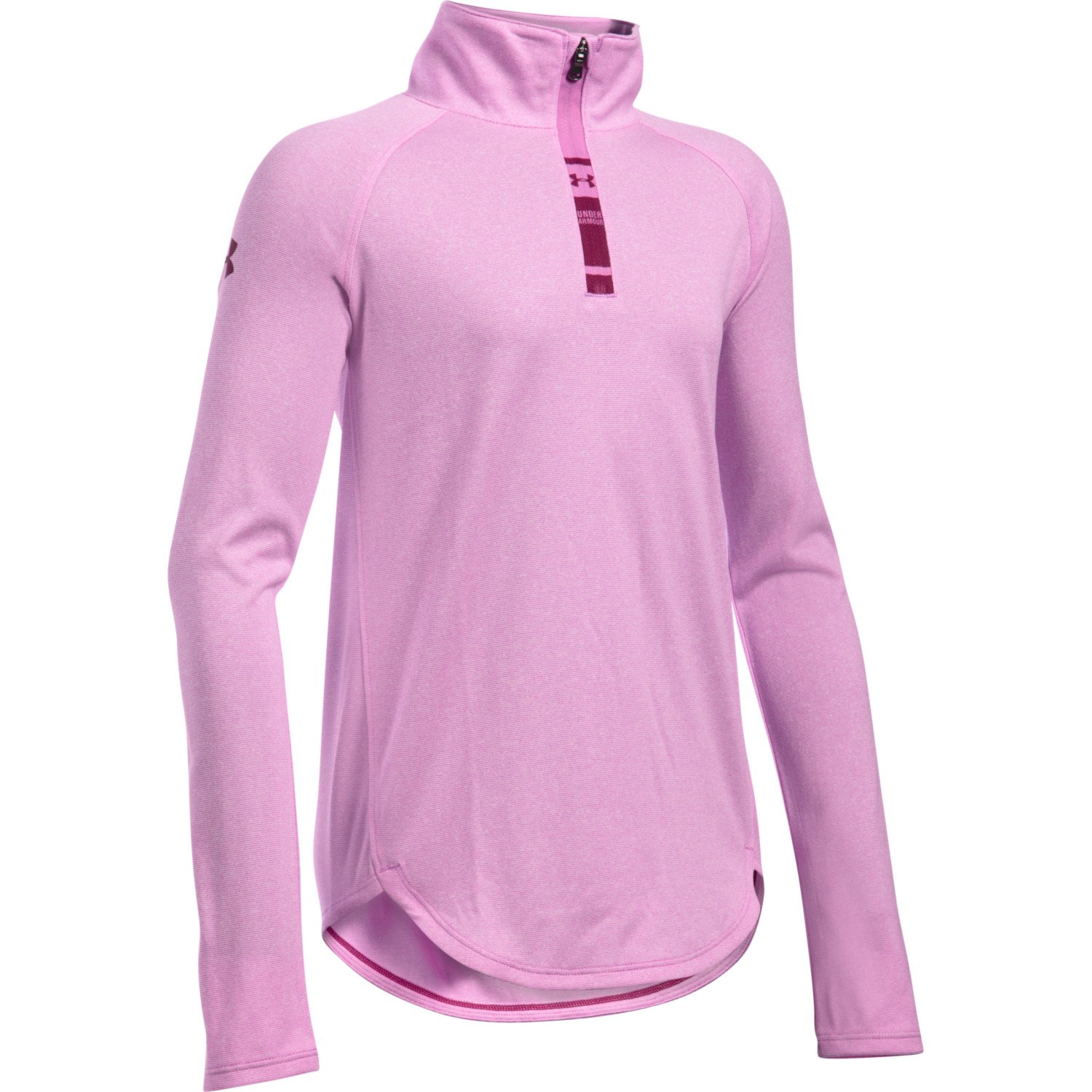 Your little one can stay warm and stylish in the Under Armour™ Girls' Tech Novelty 1/4 Zip Jacket, which is made of 100% polyester and features raglan sleeves and a shaped hem for coverage. Anti-odor technology delivers long-lasting freshness, and the Moisture Transport System wicks away sweat for dry, comfortable wear. An allover, textured Tech stripe pattern with a UA logo on the right arm creates a unique look.