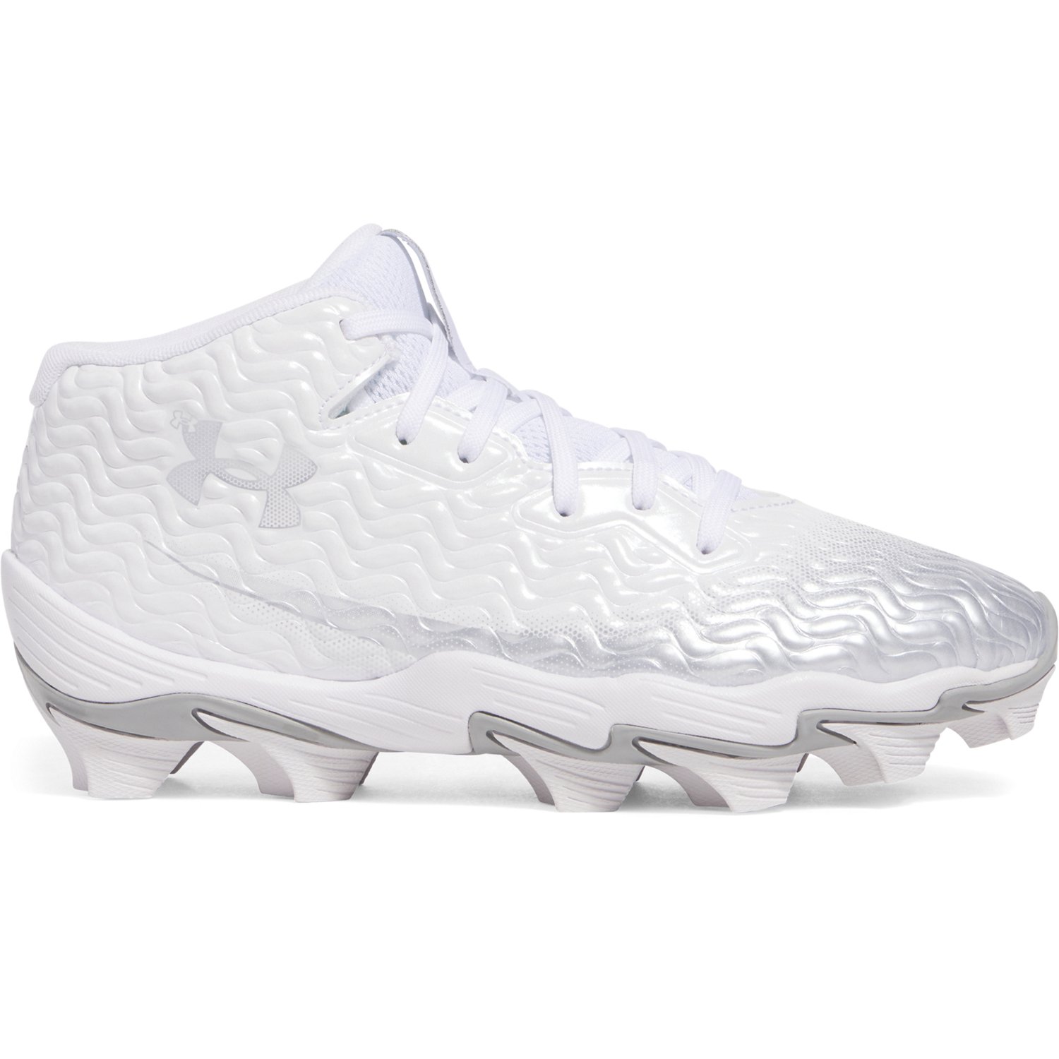 He'll put power behind his blocks in the Under Armour Kids' Spotlight Hammer Football Cleats. These lightweight football cleats are as durable as they are comfortable, with foam insoles and cushioned midsoles that cradle his feet in cloudlike comfort. Durable uppers combine with suede heels for a lightweight feel, and the diamond-shaped studs on a molded TPU plate dig into the ground.