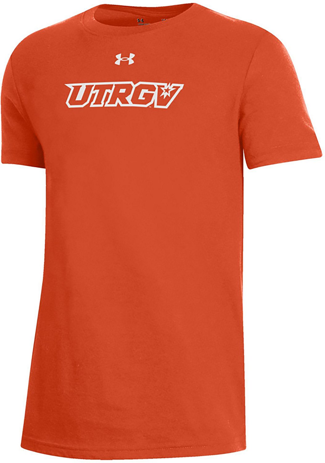 Root for your favorite team when you wear the Under Armour Kids' UT Rio Grande Valley Vaqueros School Short Sleeve T-shirt. It is made of 60% cotton and 40% polyester. The short sleeves keep you cool, and its crew neckline creates a casual look. The UT Rio Grande Valley Vaqueros graphics show off your team spirit.