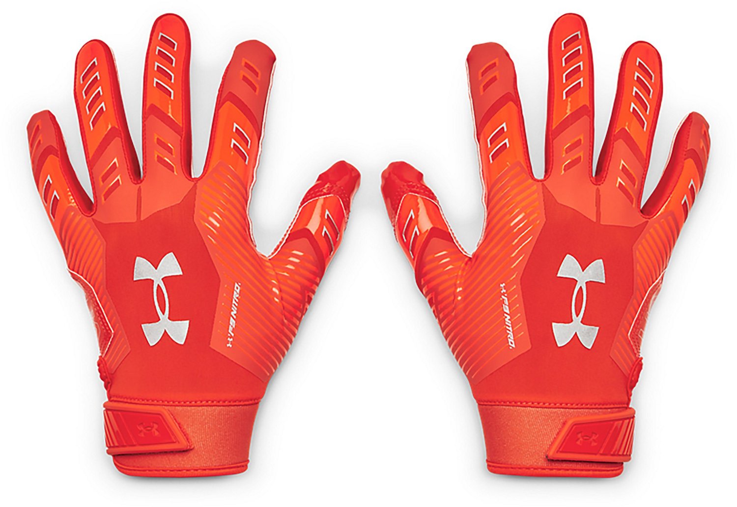 Catch more balls and protect your hands with the Under Armour Men's F9 Nitro Football Gloves. These nylon gloves have silicone print overlays for increased support and mobility. GlueGrip helps keep your gloves sticky for reliable performance and ball catching, while the palm wrap-over design offers improved grip and on-the-field protection. Hook-and-loop closures provide an adjustable and secure fit.
