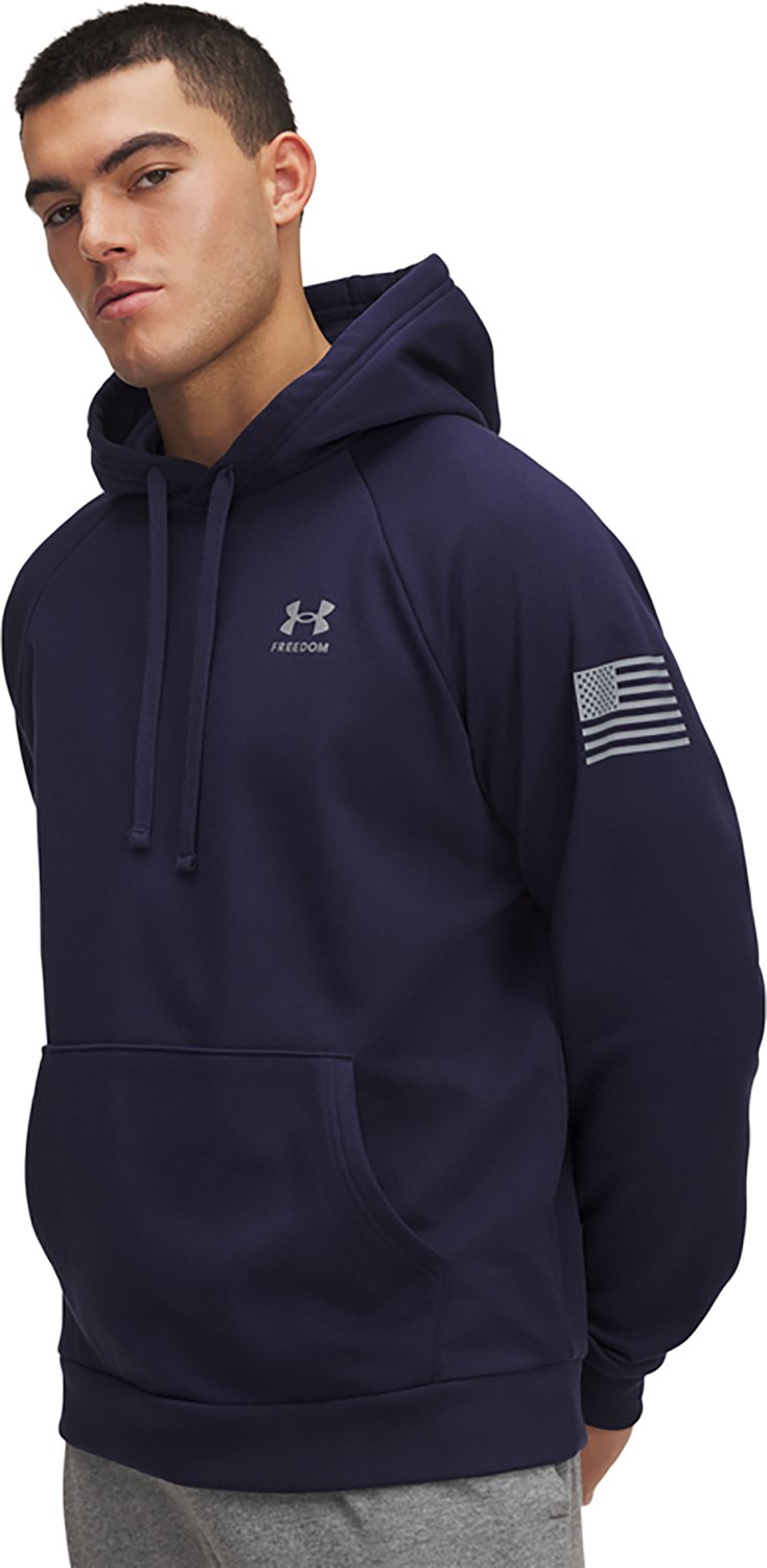 Stay cozy in style with the Under Armour Men's Freedom Flag Hoodie. It is made of 56% cotton and 44% polyester for soft comfort and durability, and the hoodie boasts a brushed fleece interior for warmth. Features an American flag graphic on the sleeve.