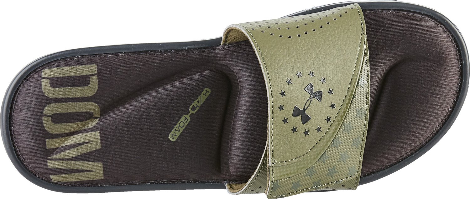 Slip on the Under Armour Men's Ignite Freedom Slides before you leave the house. The Performance 4D Foam® footbeds absorb shock after each step, and the anatomical contours conform to your feet. The synthetic straps are adjustable for a secure fit, and the EVA outsoles with traction pods in the heels are lightweight and durable.