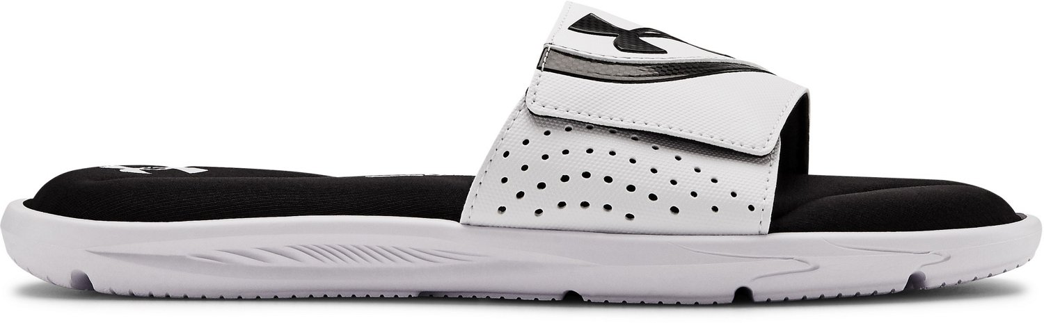 Slip on the Under Armour Men's Ignite VI Soccer Slides after your big game. The adjustable synthetic straps with foam underneath ensure a snug feel, and the footbeds built with 2 layers of Performance 4D Foam® deliver a comfy feel. Anatomical contours support your feet, and the EVA outsoles with traction pods in the heels are durable and light.