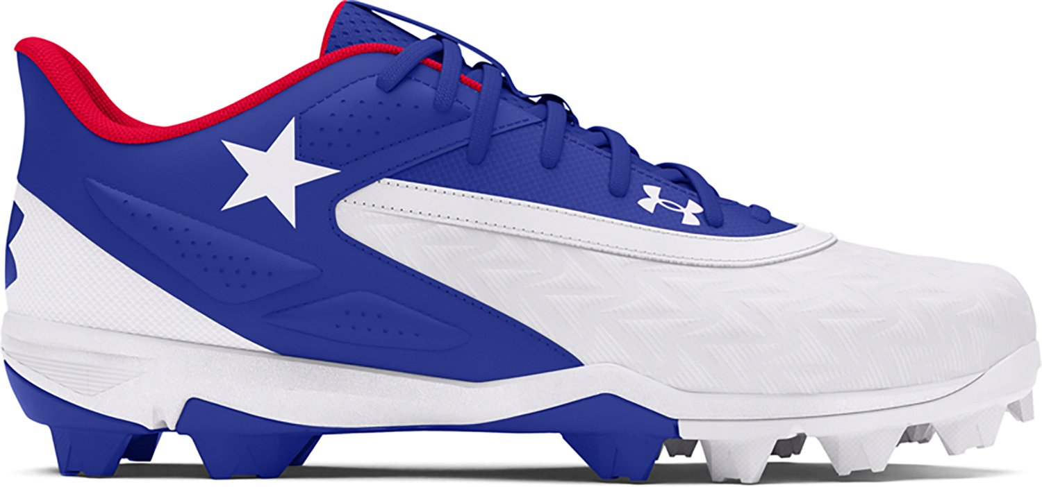 Swing for the fences with the Under Armour Men's Leadoff Low RM Texas Baseball Cleats. The synthetic uppers afford durability, and full-length EVA midsoles provide cushioned comfort while evenly distributing cleat pressure underfoot. Rubber molded outsoles offer traction and durability, while padded collars and heels deliver additional comfort.