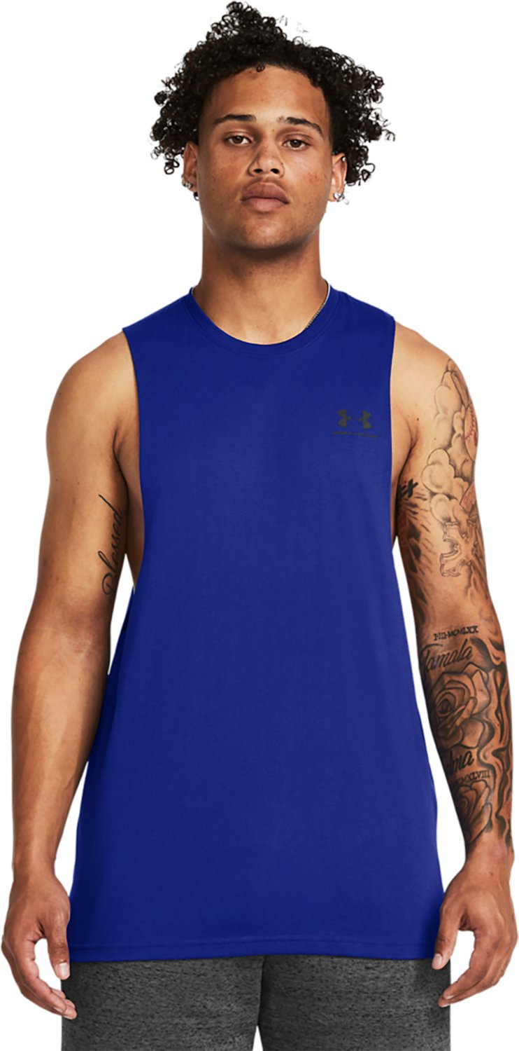 Stay cool while working out in the Under Armour Men's Sportstyle Left Chest Cut-off Sleeveless Top. This top is made from 60% cotton and 40% polyester super-soft, cotton-blend fabric for all-day comfort. The generous, cut-off style armholes allow for added mobility and range of motion.