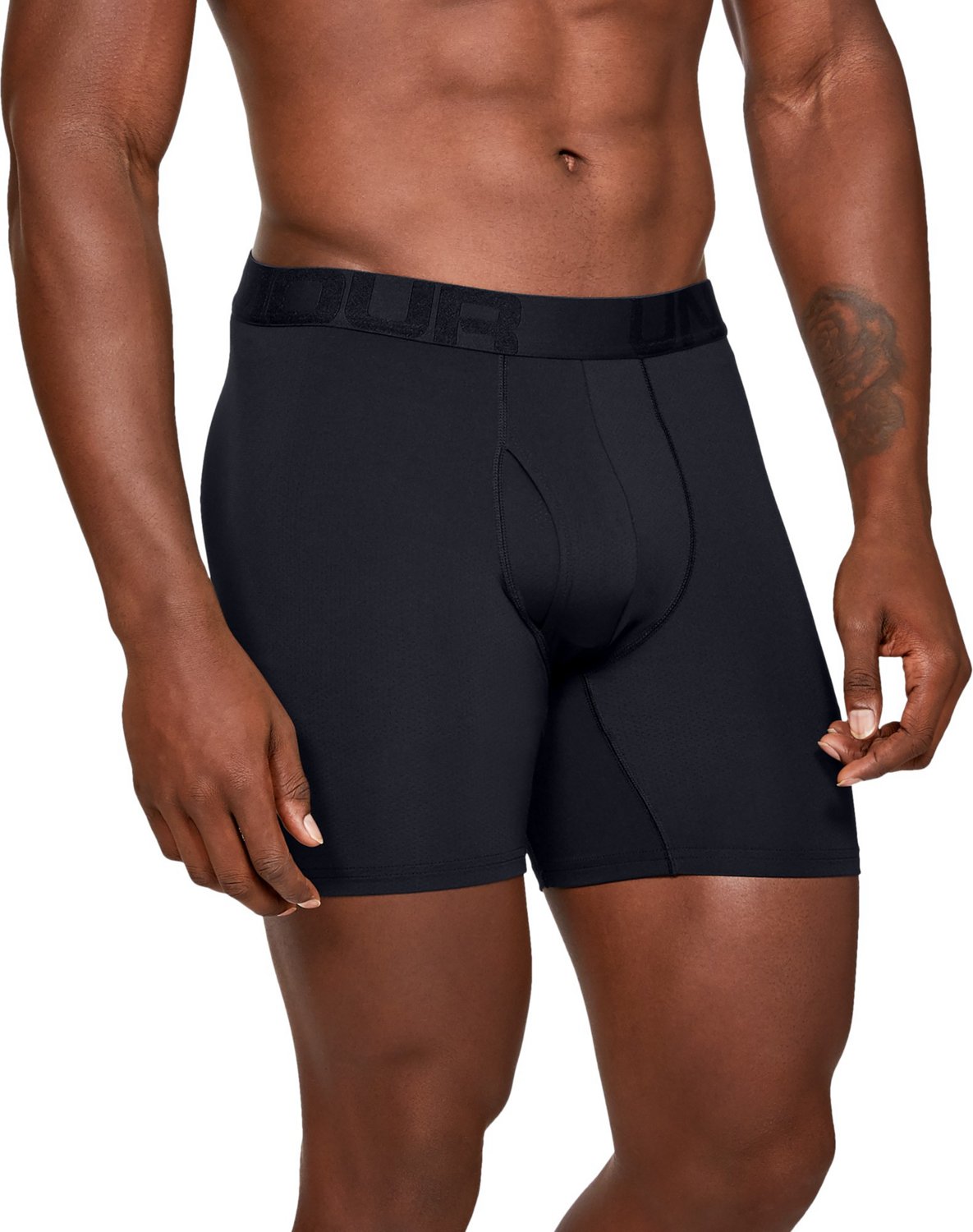 Make sure you're comfortable while going about your day with the Under Armour Men's Tech Mesh Boxerjock Briefs 6 in 2-Pack. The sweat-wicking material helps keep you dry, while the mesh design offers breathability. The 4-way stretch fabric provides flexible movement, and the anti-odor technology limits the growth of odor-causing microbes. The 92% polyester and 8% elastane construction has no back or side seams to hinder irritation.