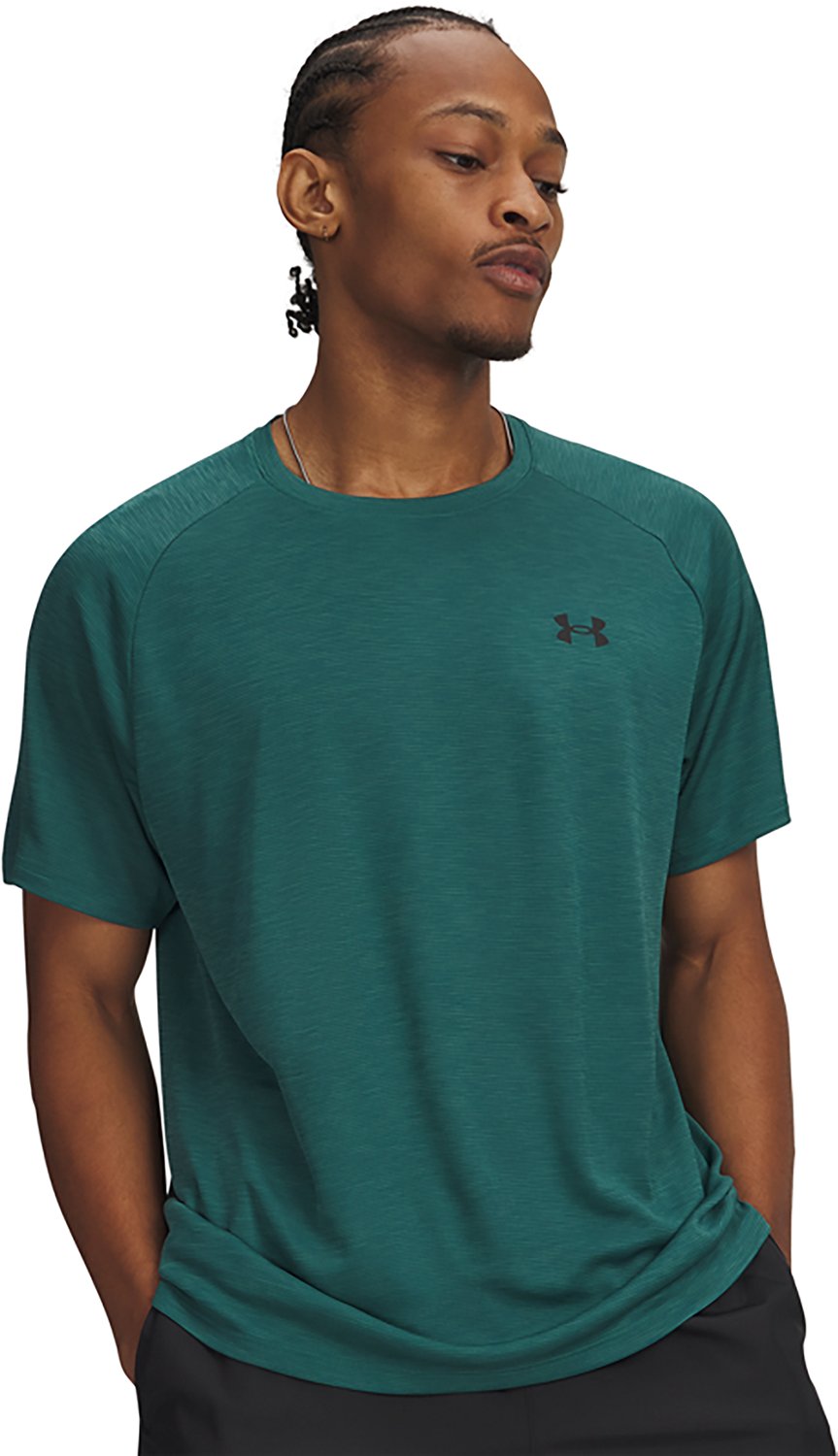 Take on the day in style in the Under Armour Men's Tech Textured T-shirt. The moisture wicking technology keeps you cool and dry, and the polyester fabric feels soft and comfy. The UA Techâ„¢ fabric dries quick for a natural feel.