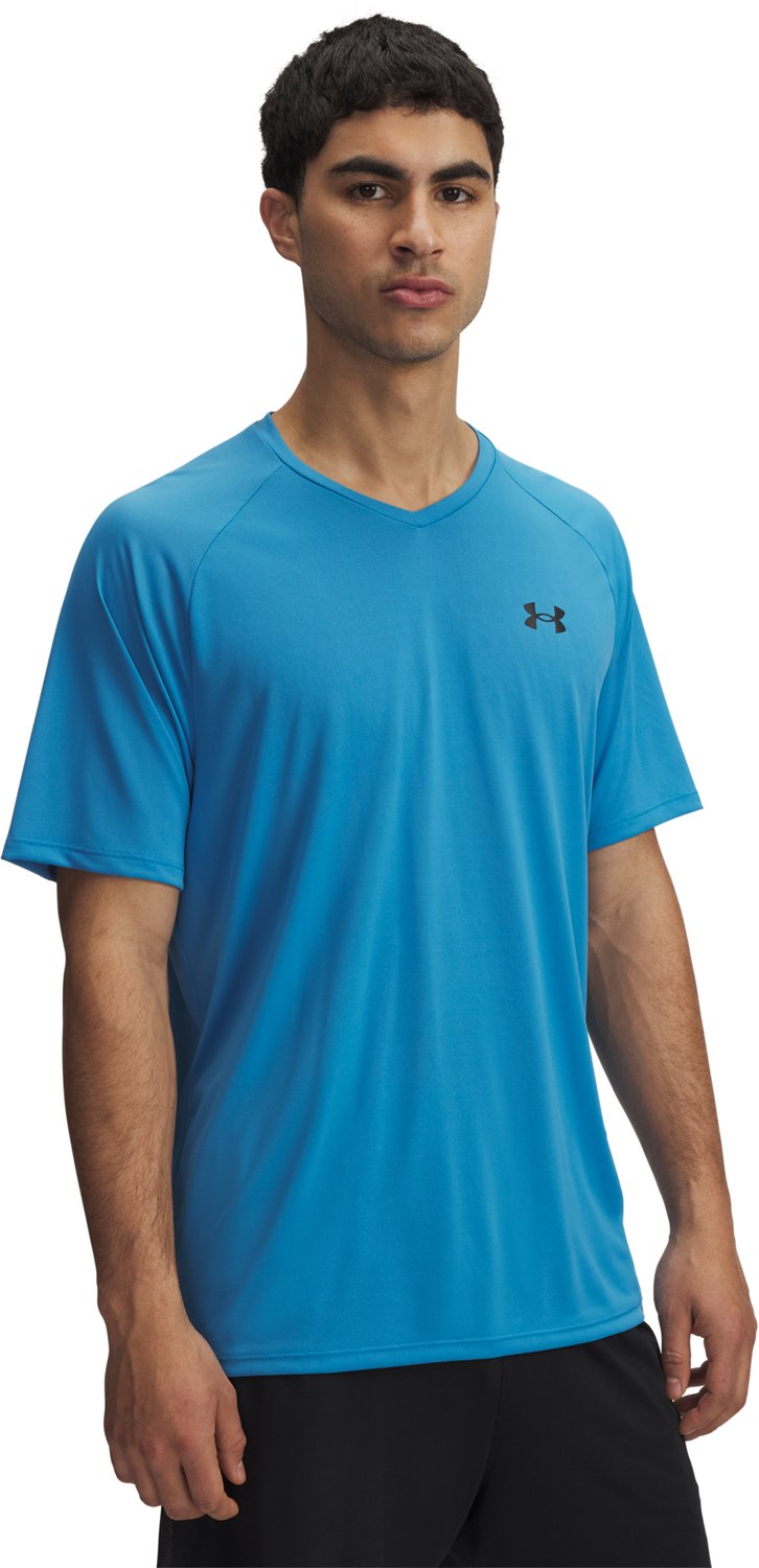 Whether you're relaxing at home or training at the gym, the Under Armour Men's Tech V-neck T-shirt will help you feel cool and comfortable. It features UA Techâ„¢ fabric with moisture-wicking and antimicrobial properties and is designed with short sleeves and a shaped hem. The Under Armourâ„¢ logo at the left chest gives off a sporty look.