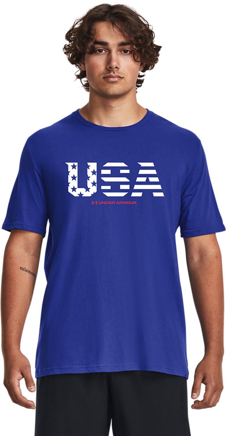 The Under Armour Men's USA Short Sleeve Tee celebrates American pride with a comfortable, lightweight design. Made from soft, quick-drying fabric, this **short-sleeve** tee is ideal for casual wear or training. The bold USA print adds a patriotic touch to your wardrobe.