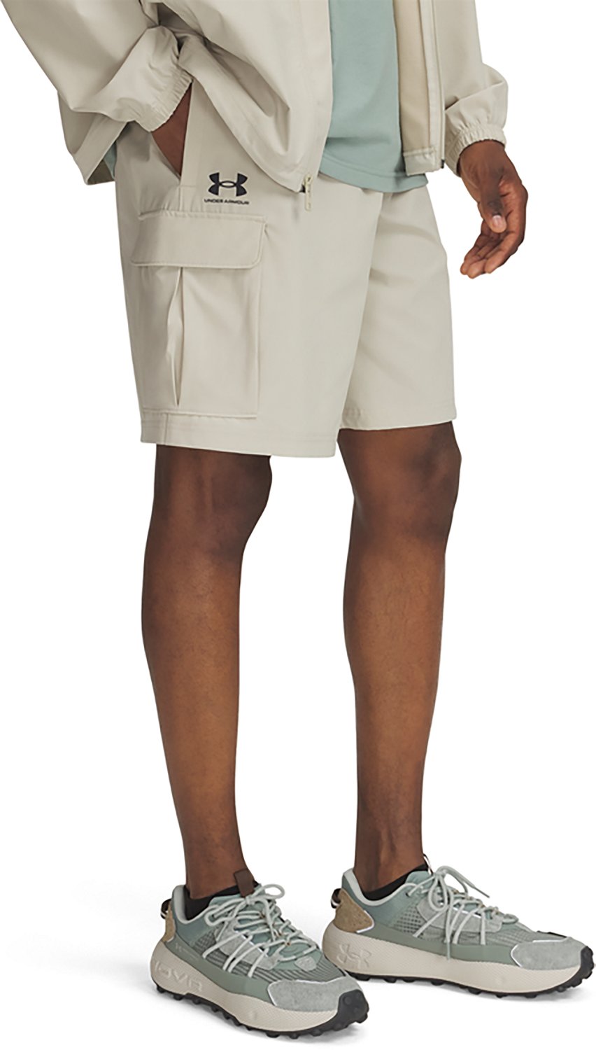 Tackle the outdoors in the Under Armour Men's Vibe Woven Cargo Shorts 8 in. They are made of 87% polyester and 13% elastane. The lightweight stretch woven fabric delivers superior comfort and durability, and their 4-way stretch material moves in all directions. The UA Storm technology repels water without sacrificing breathability.