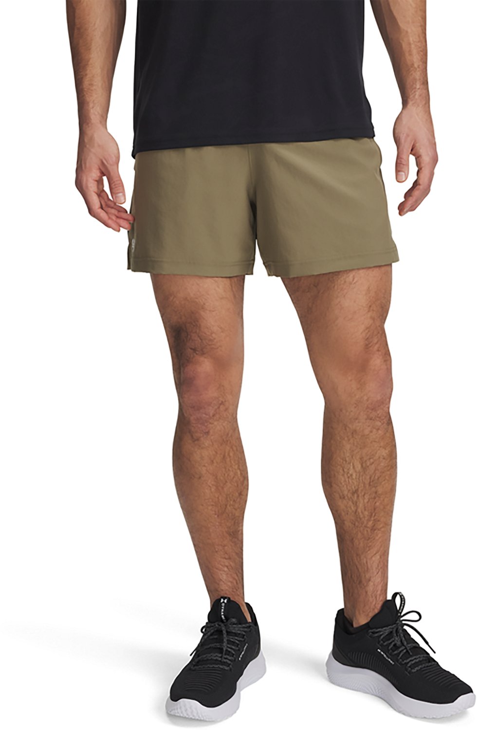 Exercise like a pro in the Under Armour Men's Woven Shorts 5 in. The polyester fabric offers a soft feel, and the encased elastic waistband with an internal drawstring allows you to tighten or loosen the fit with ease. The moisture wicking technology makes sure you stay dry and cool, and the wordmark detail highlights an eye-catching appearance.