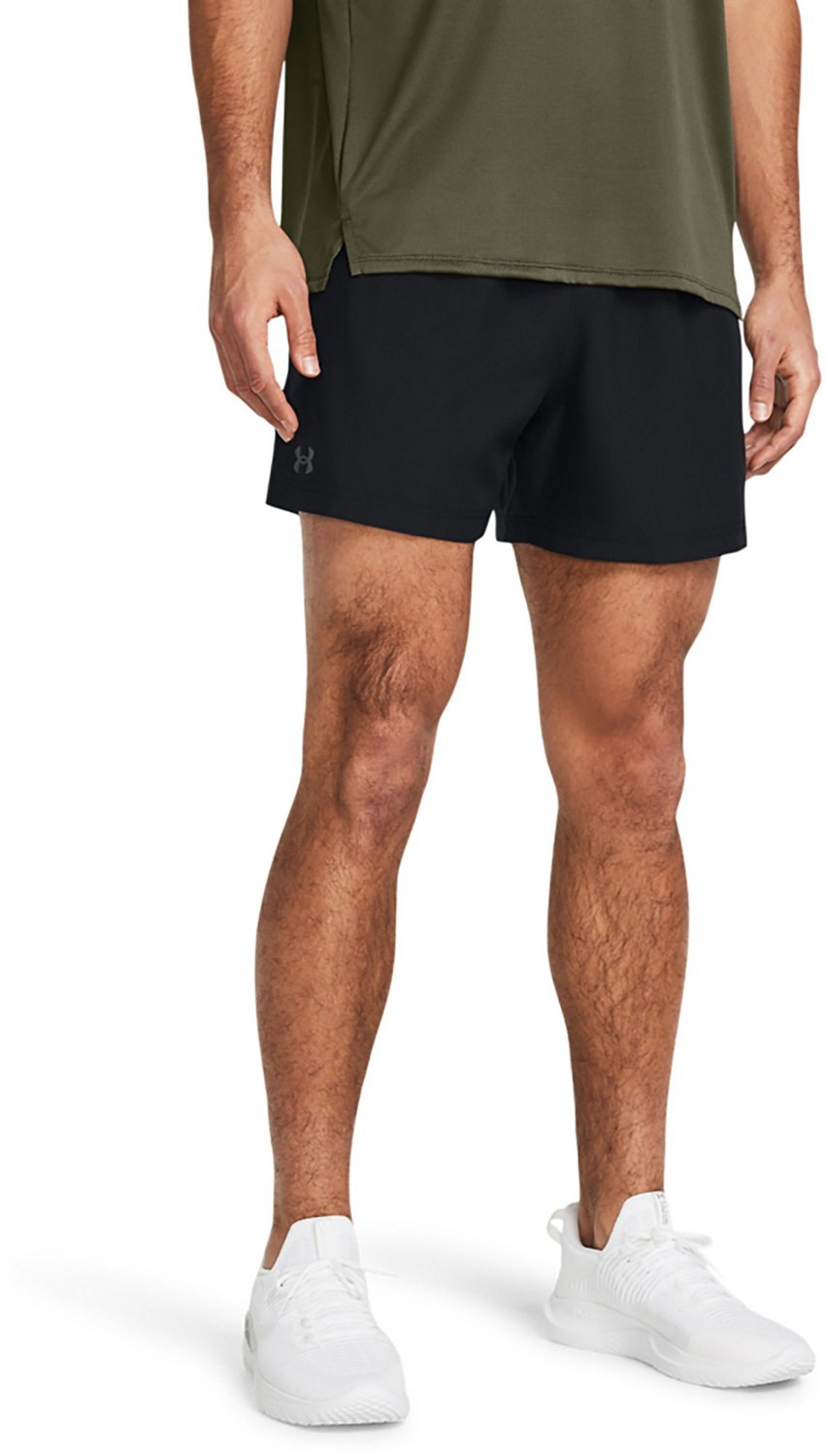 Exercise like a pro in the Under Armour Men's Woven Shorts 5 in. The polyester fabric offers a soft feel, and the encased elastic waistband with an internal drawstring allows you to tighten or loosen the fit with ease. The moisture wicking technology makes sure you stay dry and cool, and the wordmark detail highlights an eye-catching appearance.