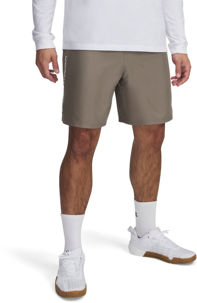Exercise like a pro in the Under Armour Men's Woven Wordmark Shorts 8.25 in. The polyester fabric offers a soft feel, and the encased elastic waistband with an internal drawstring allows you to tighten or loosen the fit with ease. The moisture wicking technology makes sure you stay dry and cool, and the wordmark detail highlights an eye-catching appearance.