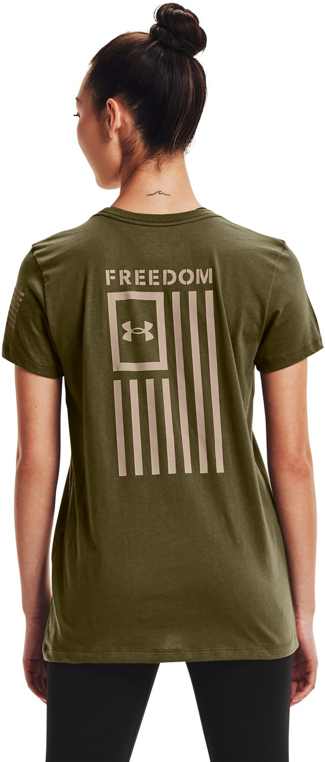 Let freedom ring with the Under Armour Women's Freedom Flag T-shirt. Composed of a cotton and polyester blend, this shirt has a sleek athletic feel and dries quickly to keep you cool, dry and focused. A front flag graphic shows your support for your country and its defenders.