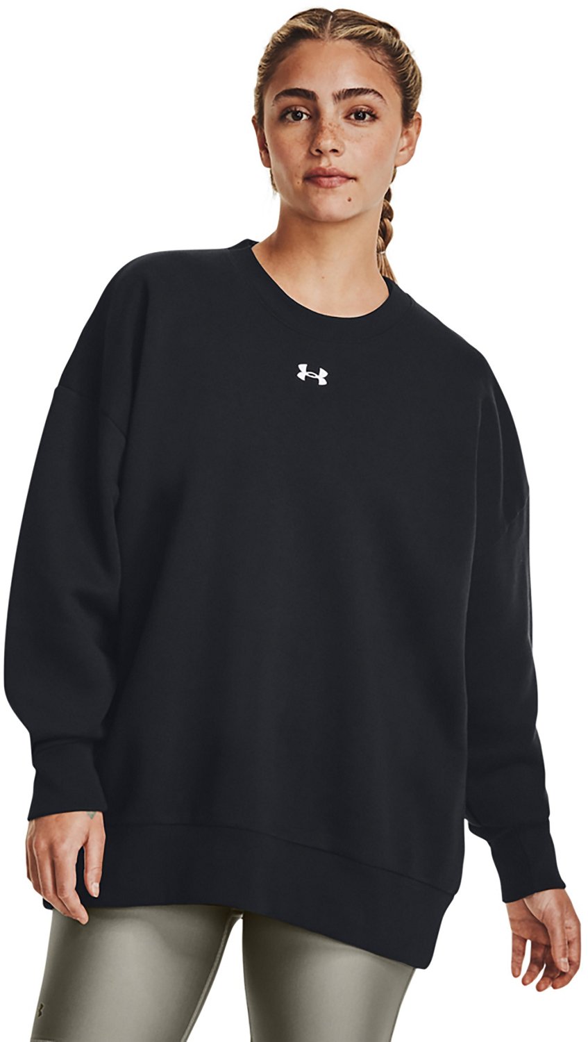 Layer up against the chill with the Under Armour Women's Rival Fleece Oversize Crew Sweatshirt. Brushed fleece fabric feels soft and warm against your skin. The oversize cut adds comfort, while the ribbed cuffs and hem provide a snug fit and elevated look.