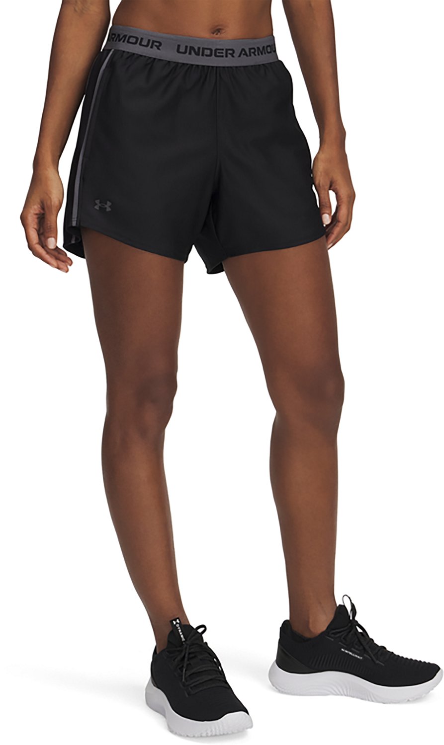 Look your best when you wear the Under Armour Women's Tech™ Play Up Shorts 5 in. They are made of 100% polyester. The material wicks away sweat and dries quickly, and their low-rise, exposed elastic waistband is decorated with an updated wordmark. The shaped hem creates a more flattering fit and a better range of motion.