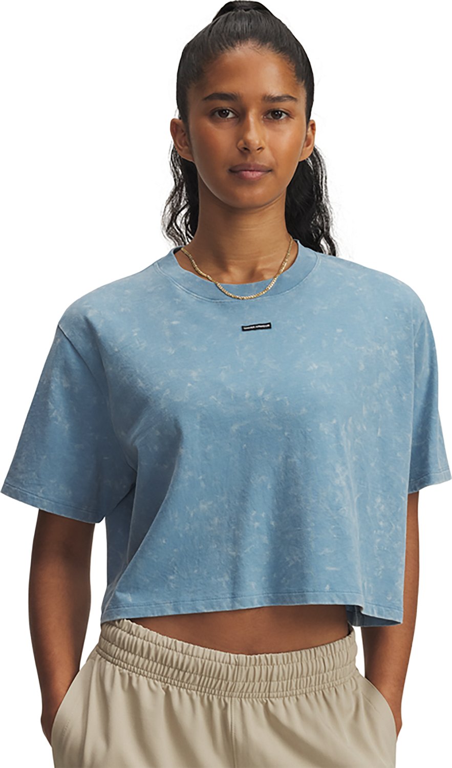 Sport a casual look with the Under Armour Women's Wash Logo Boxy Crop T-shirt. The cotton and polyester material provides a comfortable feel, while the drop hem shoulders deliver an oversized fit. The cropped length adds a stylish touch.