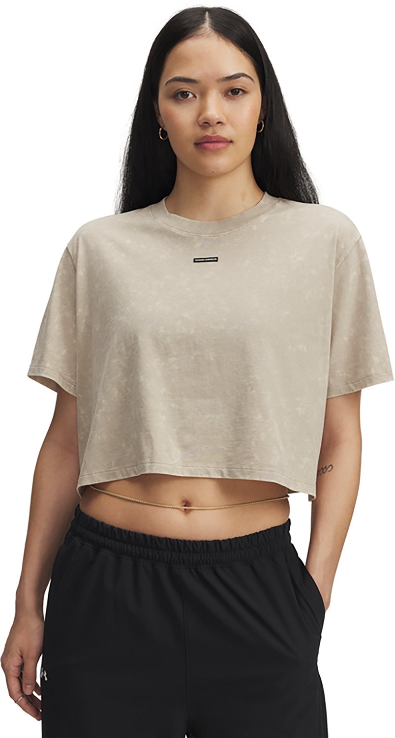 Sport a casual look with the Under Armour Women's Wash Logo Boxy Crop T-shirt. The cotton and polyester material provides a comfortable feel, while the drop hem shoulders deliver an oversized fit. The cropped length adds a stylish touch.