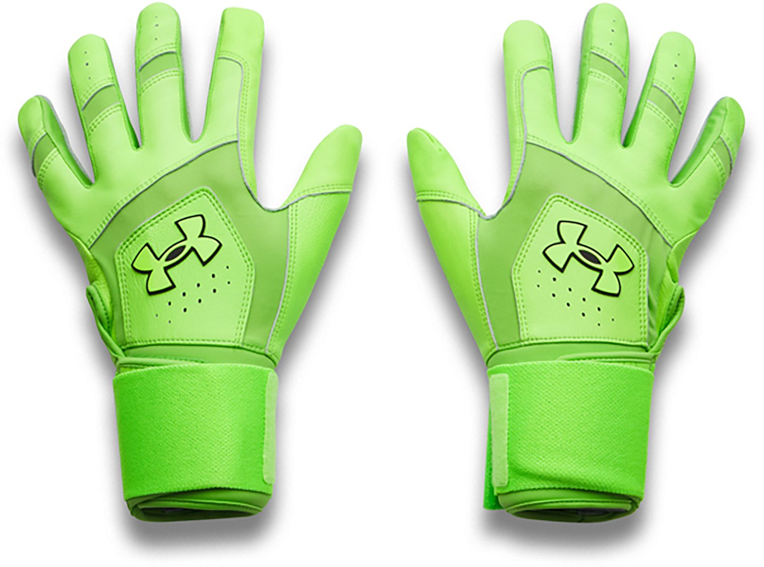 Get a better grip on your bat with the Under Armour Yard 10 Long Cuff Baseball Batting Gloves. Its lightweight, stretchy HeatGear® fabric on back of hand with leather overlays add support. The premium embossed leather palm provide an ultimate feel, and its perforations on fingers for strategic ventilation. The stretchy neoprene wrist with adjustable strap enhances extended wrist support.