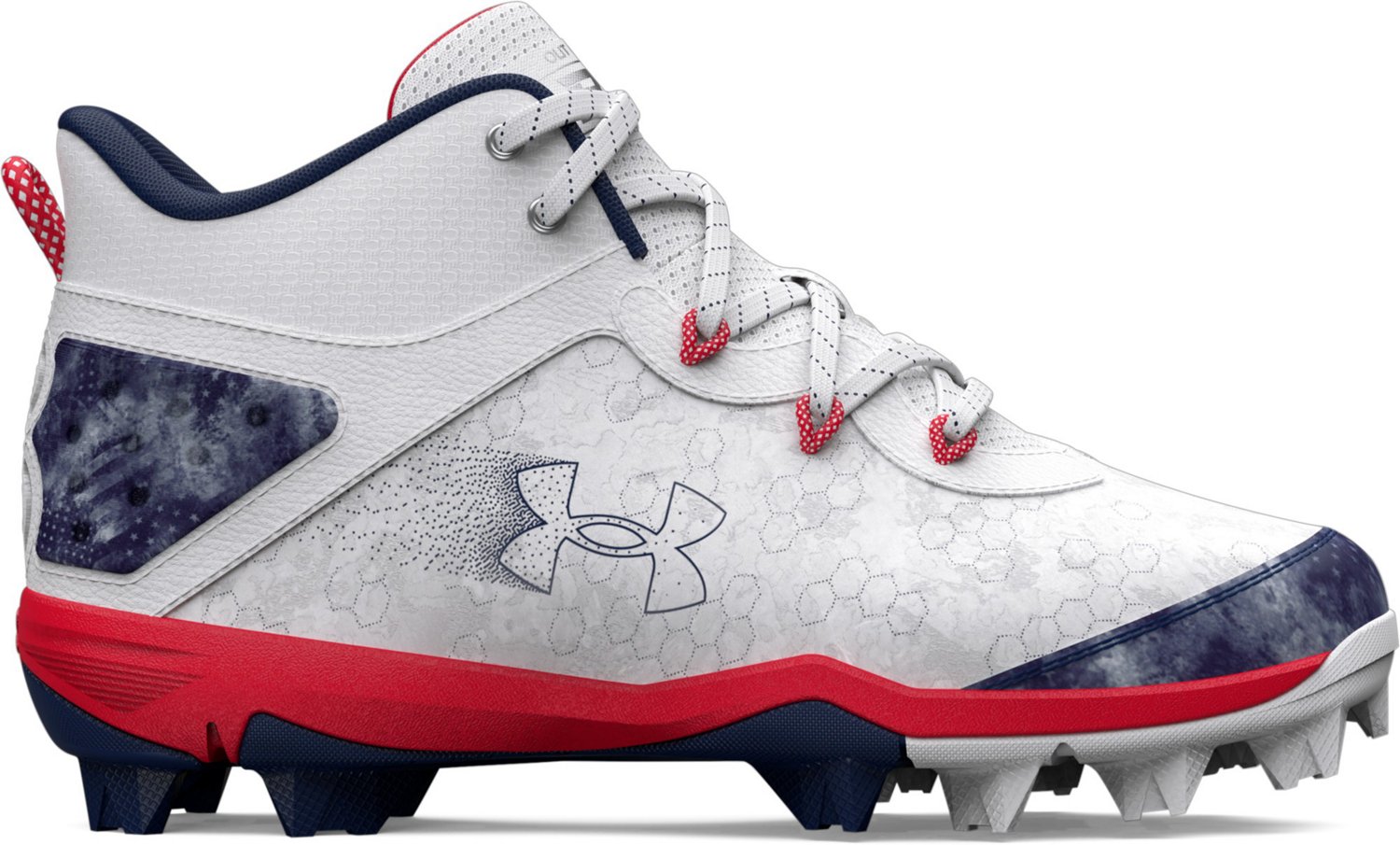 Tear up the bases while wearing Under Armour Kids Harper 8 Mid RM USA Baseball Cleats. Lightweight mesh uppers breathe freely to keep feet fresh, while internal TPU lacing systems stabilize your fit. Full-length EVA cushioning enhances comfort. Rubber molded outsoles offer versatile traction for a variety of field types.