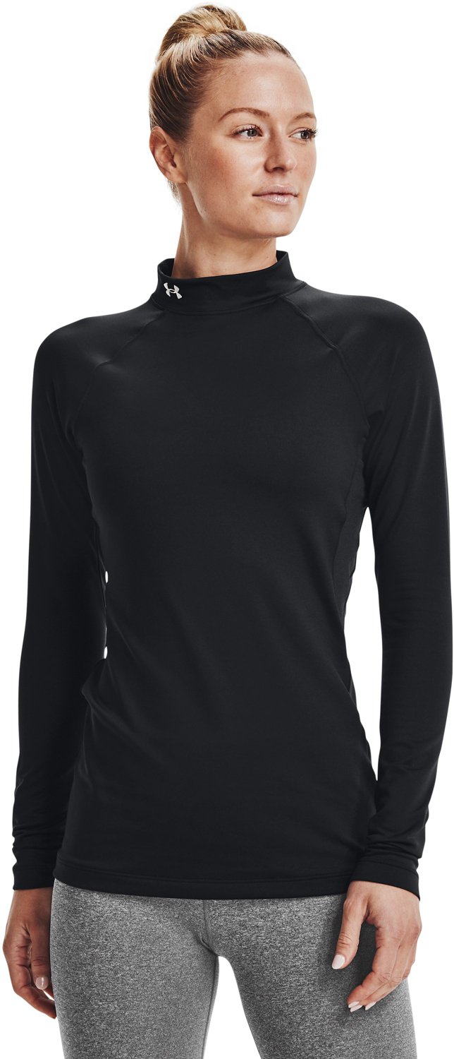 Enjoy comfort all day long in the Under Women's Armour Authentics Mock Neck Shirt. The soft fabric wicks away sweat and helps keep you warm in frigid temps. The top also resists odors and has raglan-style sleeves for easy mobility.