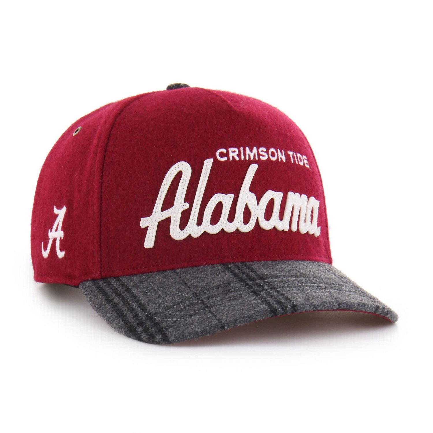 Get ready to rock that classic Alabama Crimson Tide vibe with this totally unique '47 Hitch Adjustable Hat This isn't your average cap -- it's got a retro-inspired look thanks to its relaxed fit and that cool pinched five-panel crown But the real game-changer The windowpane plaid fabric dressing up the visor and button adds a serious touch of tailored style making it feel right at home for crisp football weather Your unwavering school pride is front and center with bold fabric appliqu and flat embroidered wordmarks while a separate embroidered logo sits sharp on the side